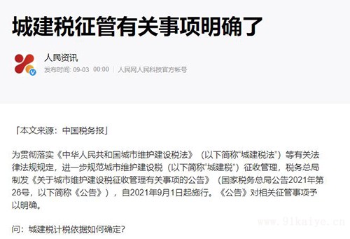 為貫徹落實(shí)《中華人民共和國(guó)城市維護(hù)建設(shè)稅法》(以下簡(jiǎn)稱“城建稅法”)等有關(guān)法律法規(guī)規(guī)定,進(jìn)一步規(guī)范城市維護(hù)建設(shè)稅(以下簡(jiǎn)稱“城建稅”)征收管理,稅務(wù)總局制發(fā)《關(guān)于城市維護(hù)建設(shè)稅征收管理有關(guān)事項(xiàng)的公告》(國(guó)家稅務(wù)總局公告2021年第26號(hào),以下簡(jiǎn)稱《公告》),自2021年9月1日起施行。《公告》對(duì)相關(guān)征管事項(xiàng)予以明確。 問:城建稅計(jì)稅依據(jù)如何確定? 答:根據(jù)城建稅法等相關(guān)政策規(guī)定,城建稅計(jì)稅依據(jù)為納稅人依法實(shí)際繳納的兩稅稅額。 依法實(shí)際繳納的增值稅稅額,是指納稅人依照增值稅相關(guān)法律法規(guī)和稅收政策規(guī)定計(jì)算應(yīng)當(dāng)繳納的增值稅稅額,加上增值稅免抵稅額,扣除直接減免的增值稅稅額和期末留抵退稅退還的增值稅稅額(以下簡(jiǎn)稱“留抵退稅額”)后的金額。 依法實(shí)際繳納的消費(fèi)稅稅額,是指納稅人依照消費(fèi)稅相關(guān)法律法規(guī)和稅收政策規(guī)定計(jì)算應(yīng)當(dāng)繳納的消費(fèi)稅稅額,扣除直接減免的消費(fèi)稅稅額后的金額; 具體計(jì)算公式如下: 城建稅計(jì)稅依據(jù)=依法實(shí)際繳納的增值稅稅額+依法實(shí)際繳納的消費(fèi)稅稅額; 依法實(shí)際繳納的增值稅稅額=納稅人依照增值稅相關(guān)法律法規(guī)和稅收政策規(guī)定計(jì)算應(yīng)當(dāng)繳納的增值稅稅額+增值稅免抵稅額-直接減免的增值稅稅額-留抵退稅額; 依法實(shí)際繳納的消費(fèi)稅稅額=納稅人依照消費(fèi)稅相關(guān)法律法規(guī)和稅收政策規(guī)定計(jì)算應(yīng)當(dāng)繳納的消費(fèi)稅稅額-直接減免的消費(fèi)稅稅額。 【例1】位于某市市區(qū)的甲企業(yè)(城建稅適用稅率為7%),2021年10月申報(bào)期,享受直接減免增值稅優(yōu)惠(不包含先征后退、即征即退,下同)后申報(bào)繳納增值稅50萬元,9月已核準(zhǔn)增值稅免抵稅額10萬元(其中涉及出口貨物6萬元,涉及增值稅零稅率應(yīng)稅服務(wù)4萬元),9月收到增值稅留抵退稅額5萬元,該企業(yè)10月應(yīng)申報(bào)繳納的城建稅為:(50+6+4-5)×7%=3.85(萬元)。 【例2】位于某縣縣城的乙企業(yè)(城建稅適用稅率為5%),2021年10月申報(bào)期,享受直接減免增值稅優(yōu)惠后申報(bào)繳納增值稅90萬元,享受直接減免消費(fèi)稅優(yōu)惠后申報(bào)繳納消費(fèi)稅30萬元,該企業(yè)10月應(yīng)申報(bào)繳納的城建稅為:(90+30)×5%=6(萬元)。 問:所有兩稅稅額是否都納入城建稅計(jì)稅依據(jù)? 答:不是。納稅人因進(jìn)口貨物或境外單位和個(gè)人向境內(nèi)銷售勞務(wù)、服務(wù)、無形資產(chǎn)繳納的兩稅稅額不納入城建稅計(jì)稅依據(jù),不需要繳納城建稅。 【例3】位于某市市區(qū)的甲企業(yè)(城建稅適用稅率為7%),2021年10月申報(bào)期,申報(bào)繳納增值稅100萬元,其中50萬元增值稅是進(jìn)口貨物產(chǎn)生的,該企業(yè)10月應(yīng)申報(bào)繳納的城建稅為:(100-50)×7%=3.5(萬元)。 問:留抵退稅額在城建稅計(jì)稅依據(jù)中扣除有什么具體規(guī)則? 答:納稅人自收到留抵退稅額之日起,應(yīng)當(dāng)在以后納稅申報(bào)期從城建稅計(jì)稅依據(jù)中扣除。 留抵退稅額僅允許在按照增值稅一般計(jì)稅方法確定的城建稅計(jì)稅依據(jù)中扣除。當(dāng)期未扣除完的余額,在以后納稅申報(bào)期按規(guī)定繼續(xù)扣除。 對(duì)于增值稅小規(guī)模納稅人更正、查補(bǔ)此前按照一般計(jì)稅方法確定的城建稅計(jì)稅依據(jù),允許扣除尚未扣除完的留抵退稅額。 【例4】位于某市市區(qū)的甲企業(yè)(城建稅適用稅率為7%),2021年9月收到增值稅留抵退稅200萬元。2021年10月申報(bào)期,申報(bào)繳納增值稅120萬元(其中按照一般計(jì)稅方法100萬元,按照簡(jiǎn)易計(jì)稅方法20萬元),該企業(yè)10月應(yīng)申報(bào)繳納的城建稅為:(100-100)×7%+20×7%=1.4(萬元)。 2021年11月申報(bào)期,該企業(yè)申報(bào)繳納增值稅200萬元,均為按照一般計(jì)稅方法產(chǎn)生的,該企業(yè)11月應(yīng)申報(bào)繳納的城建稅為:(200-100)×7%=7(萬元)。 問:城建稅與兩稅如何實(shí)現(xiàn)同征同管? 答:在繳稅環(huán)節(jié),城建稅的納稅義務(wù)發(fā)生時(shí)間與兩稅的納稅義務(wù)發(fā)生時(shí)間一致,分別在繳納兩稅的同一繳納地點(diǎn)、同一繳納期限內(nèi),一并繳納對(duì)應(yīng)的城建稅。委托代征、代扣代繳、代收代繳、預(yù)繳、補(bǔ)繳等方式繳納兩稅的,也應(yīng)當(dāng)同時(shí)繳納城建稅。 需要特別說明的是,城建稅法規(guī)定對(duì)進(jìn)口貨物或者境外單位和個(gè)人向境內(nèi)銷售勞務(wù)、服務(wù)、無形資產(chǎn)繳納的兩稅稅額,不征收城建稅。因此,上述的代扣代繳,不含因境外單位和個(gè)人向境內(nèi)銷售勞務(wù)、服務(wù)、無形資產(chǎn)代扣代繳增值稅情形。 在退稅環(huán)節(jié),因納稅人多繳發(fā)生的兩稅退稅,同時(shí)退還已繳納的城建稅。但是,兩稅實(shí)行先征后返、先征后退、即征即退的,除另有規(guī)定外,不予退還隨兩稅附征的城建稅。“另有規(guī)定”主要指在增值稅實(shí)行即征即退等情形下,城建稅可以給予免稅的特殊