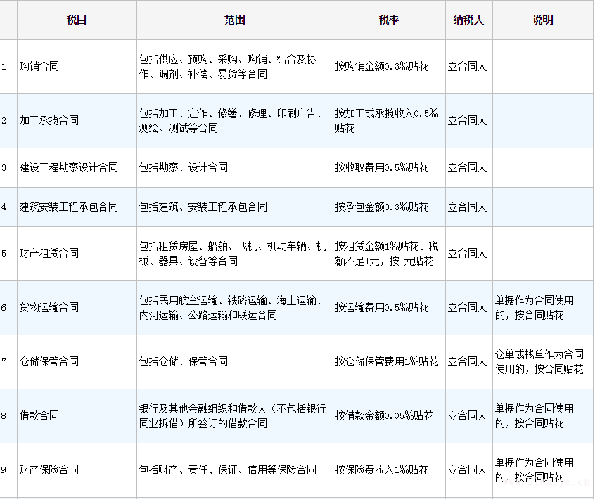 納稅申報的前提就是要計算應納稅額,但是,相關的計稅稅率,又是需要小伙伴進行掌握的。大家知道印花稅的稅率有哪些嗎?現(xiàn)行的印花稅稅率是多少呢?最新印花稅的稅率匯總表(全),小編整理好了,供大家在處理稅務申報時,做個參考! 印花稅的稅率 印花稅的稅率有“比例稅率”和“定額稅率”。(1)比例稅率:①經(jīng)濟合同;②產(chǎn)權轉移書據(jù);③營業(yè)賬簿內(nèi)中記載資金的賬簿(實收資本+資本公積)。(2)定額稅率:①權利許可證照;②營業(yè)賬簿中的其他賬簿(日記賬和各種明細容賬等)。 印花稅稅率規(guī)定: 1、購銷合同:按購銷金額萬分之三貼花; 2、加工承攬合同:按加工或承攬收入萬分五貼花; 3、建設工程勘察設計合同:按收取費用萬分之五貼花; 4、建筑安裝工程承包合同:按承包金額萬分之三貼花; 5、財產(chǎn)租賃合同:按租賃金額千分之一貼花;稅額不足一元的按一元貼花; 6、貨物運輸合同:按運輸費用萬分之五貼花;單據(jù)作為合同使用的,按合同貼花; 7、倉儲保管合同: 按倉儲保管費用千分之一貼花;倉單或棧單作為合同使用的,按合同貼花; 8、借款合同:按借款金額萬分之零點五貼花,單據(jù)作為合同使用的,按合同貼花; 9、 財產(chǎn)保險合同:按保費收入千分之一貼花;單據(jù)作為合同使用的,按合同貼花; 10、技術合同:按所載金額萬分之三貼花; 11、產(chǎn)權轉移書據(jù):按所載金額萬分之五貼花; 12、營業(yè)帳簿:(1)記載資金的賬簿按“實收資本”和“資本公積”兩賬戶的所記載的金額萬分之五貼花 ;(2)其他賬簿按件5元貼花; 13、權利、許可證照:包括政府部門發(fā)給的房屋產(chǎn)權證、工商 營業(yè)執(zhí)照、商標注冊證、專利證、土地使用證按件貼花五元 。 印花稅稅目稅率表 以上是玖邀開業(yè)網(wǎng)小編為您整理的關于最新印花稅的稅率匯總表的內(nèi)容,希望對您有所幫助。 |