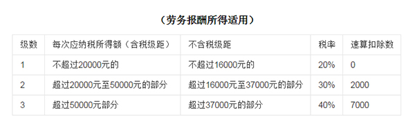 勞務(wù)所得個人所得稅計算如下 一、勞務(wù)報酬所得應(yīng)納稅所得額的計算 (一)個人提供勞務(wù)取得含稅勞務(wù)報酬(即稅前勞務(wù)報酬)所得個人所得稅的計算 1、應(yīng)納稅所得額的確認(rèn) 1.1含稅勞務(wù)報酬所得不超過4000元的,應(yīng)納稅所得額=含稅勞務(wù)報酬所得-800; 1.2含稅勞務(wù)報酬所得超過4000元的,應(yīng)納稅所得額=含稅勞務(wù)報酬所得×(1-20%)。 2、個人所得稅應(yīng)納稅額的計算 個人所得稅應(yīng)納稅額=應(yīng)納稅所得額×適用稅率-速算扣除數(shù) 注:按照應(yīng)納稅所得額查對應(yīng)適用稅率和速算扣除數(shù) (二)個人提供勞務(wù)取得不含稅勞務(wù)報酬(即稅后勞務(wù)報酬)所得個人所得稅的計算 個人為企業(yè)提供勞務(wù),雙方約定的勞務(wù)報酬更多情況是一個稅后支付額,即企業(yè)支付給個人的勞務(wù)報酬是個人的稅后所得,因此,企業(yè)必須將稅后所得轉(zhuǎn)換為稅前報酬,按照稅前報酬列支企業(yè)的成本費(fèi)用,同時代扣代繳個人所得稅。 由于勞務(wù)報酬在計算個人所得稅時的扣除額分段以及應(yīng)納稅額的加成規(guī)定,經(jīng)過推算得出不含稅勞務(wù)報酬收入額對應(yīng)的稅率表(注意,這里是收入額,而非應(yīng)納稅所得額), 1.1不含稅收入額不超過3360元的換算為含稅勞務(wù)報酬收入公式如下: 含稅勞務(wù)報酬收入=不含稅勞務(wù)收入額/(1-20%)-200 1.2不含稅收入額超過3360元的換算為含稅勞務(wù)報酬收入公式如下: 含稅勞務(wù)報酬收入=(不含稅勞務(wù)收入額-速算扣除數(shù))/換算系數(shù) 注:公式中個數(shù)據(jù)請根據(jù)表二中對應(yīng)的金額確認(rèn)。 2、個人所得稅應(yīng)納稅額的計算 2.1方式一,根據(jù)上述公式換算含稅勞務(wù)報酬收入按照表一的稅率計算應(yīng)納稅額,祥見上文。 2.2方式二,根據(jù)表二分步計算 2.2.1不含稅收入額不超過3360元的 第一步,根據(jù)不含稅收入額查表二中對應(yīng)數(shù)據(jù)計算應(yīng)納稅所得額,公式如下: 應(yīng)納稅所得額=(不含稅收入額-800)/(1-稅率) 第二步,根據(jù)應(yīng)納稅所得額查表一中對應(yīng)數(shù)據(jù)計算應(yīng)納稅額,公式如下: 應(yīng)納稅額=應(yīng)納稅所得額×適用稅率(按表一對應(yīng)數(shù)據(jù)計算) 2.2.2不含稅收入額超過3360元的: 第一步,根據(jù)不含稅收入額查表二中對應(yīng)數(shù)據(jù)計算應(yīng)納稅所得額,公式如下: 應(yīng)納稅所得額=(不含稅收入額一速算扣除數(shù))×(1-20%)/換算系數(shù) 第二步,根據(jù)應(yīng)納稅所得額查表一中對應(yīng)數(shù)據(jù)計算應(yīng)納稅額,公式如下: 應(yīng)納稅額=應(yīng)納稅所得額×適用稅率-速算扣除數(shù) 以上是玖邀開業(yè)網(wǎng)小編為您整理的關(guān)于勞務(wù)所得個人所得稅如何計算的內(nèi)容,希望對您有所幫助。 |