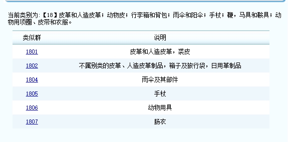 ,適用于:皮革和人造皮革;毛皮;行李箱和背包;雨傘和陽傘;手杖;鞭,馬具和鞍具;動(dòng)物用項(xiàng)圈、皮帶和衣服。