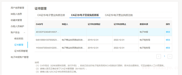電子營(yíng)業(yè)執(zhí)照線上更新操作手冊(cè) 一、業(yè)務(wù)概述 納稅人使用電子營(yíng)業(yè)執(zhí)照進(jìn)行登錄和辦稅時(shí),需要先對(duì)電子營(yíng)業(yè)執(zhí)照進(jìn)行注冊(cè)后才能在電子稅務(wù)局進(jìn)行使用,電子稅務(wù)局提供電子營(yíng)業(yè)執(zhí)照線上更新功能。 二、業(yè)務(wù)前提 1. 納稅人登記狀態(tài)為正常; 2. 電子營(yíng)業(yè)執(zhí)照在有效期內(nèi);如屬授權(quán)使用的,需在授權(quán)期內(nèi); 三、功能節(jié)點(diǎn) 電子稅務(wù)局——我的信息——用戶管理——證書管理——CA證書/電子營(yíng)業(yè)執(zhí)照更新 四、操作步驟 登錄電子稅務(wù)局,點(diǎn)擊首頁菜單欄中“我的信息”進(jìn)入用戶管理,選擇證書管理并切換至CA證書/電子營(yíng)業(yè)執(zhí)照更新Tab頁。 選擇電子營(yíng)業(yè)執(zhí)照的記錄,點(diǎn)擊修改。 選則電子營(yíng)業(yè)執(zhí)照進(jìn)行掃碼更新 掃碼完成后,完成電子營(yíng)業(yè)執(zhí)照的更新 |