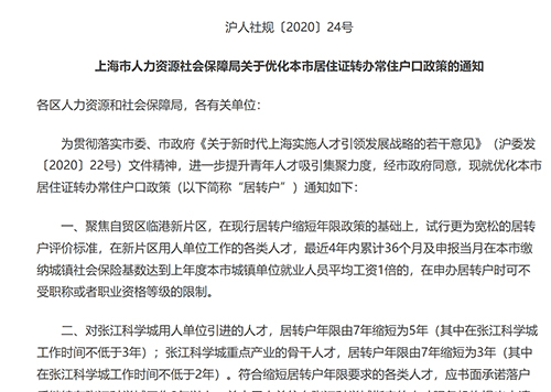 關(guān)于優(yōu)化本市居住證轉(zhuǎn)辦常住戶口政策的通知 各區(qū)人力資源和社會(huì)保障局,各有關(guān)單位: 為貫徹落實(shí)市委、市政府《關(guān)于新時(shí)代上海實(shí)施人才引領(lǐng)發(fā)展戰(zhàn)略的若干意見(jiàn)》(滬委發(fā)〔2020〕22號(hào))文件精神,進(jìn)一步提升青年人才吸引集聚力度,經(jīng)市政府同意,現(xiàn)就優(yōu)化本市居住證轉(zhuǎn)辦常住戶口政策(以下簡(jiǎn)稱“居轉(zhuǎn)戶”)通知如下: 一、聚焦自貿(mào)區(qū)臨港新片區(qū),在現(xiàn)行居轉(zhuǎn)戶縮短年限政策的基礎(chǔ)上,試行更為寬松的居轉(zhuǎn)戶評(píng)價(jià)標(biāo)準(zhǔn),在新片區(qū)用人單位工作的各類人才,最近4年內(nèi)累計(jì)36個(gè)月及申報(bào)當(dāng)月在本市繳納城鎮(zhèn)社會(huì)保險(xiǎn)基數(shù)達(dá)到上年度本市城鎮(zhèn)單位就業(yè)人員平均工資1倍的,在申辦居轉(zhuǎn)戶時(shí)可不受職稱或者職業(yè)資格等級(jí)的限制。 二、對(duì)張江科學(xué)城用人單位引進(jìn)的人才,居轉(zhuǎn)戶年限由7年縮短為5年(其中在張江科學(xué)城工作時(shí)間不低于3年);張江科學(xué)城重點(diǎn)產(chǎn)業(yè)的骨干人才,居轉(zhuǎn)戶年限由7年縮短為3年(其中在張江科學(xué)城工作時(shí)間不低于2年)。符合縮短居轉(zhuǎn)戶年限要求的各類人才,應(yīng)書(shū)面承諾落戶后繼續(xù)在張江科學(xué)城工作2年以上,并由用人單位向張江科學(xué)城指定的人才服務(wù)機(jī)構(gòu)提出申請(qǐng)后(推薦表樣式見(jiàn)附件),按本市居轉(zhuǎn)戶規(guī)定進(jìn)行申報(bào)。 三、在本市行政區(qū)域內(nèi)注冊(cè)的用人單位工作并持有《上海市居住證》的境內(nèi)人員,最近4年內(nèi)累計(jì)36個(gè)月及申報(bào)當(dāng)月在本市繳納城鎮(zhèn)社會(huì)保險(xiǎn)基數(shù)達(dá)到上年度本市城鎮(zhèn)單位就業(yè)人員平均工資2倍的,在申辦居轉(zhuǎn)戶時(shí)可不受職稱或者職業(yè)資格等級(jí)的限制。 四、在本市被評(píng)聘為中級(jí)職稱或者具有技師(國(guó)家二級(jí)職業(yè)資格證書(shū))職業(yè)資格的人員申辦居轉(zhuǎn)戶的,應(yīng)達(dá)到一定的市場(chǎng)化評(píng)價(jià)標(biāo)準(zhǔn)。 本通知自2020年12月1日起施行,有效期至2024年12月31日。 附件:張江科學(xué)城持有《上海市居住證》人員申辦本市常住戶口推薦表 上海市人力資源和社會(huì)保障局 2020年11月13日 |