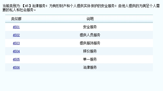 商標第四十五大類包含哪些 【第四十五類】法律服務;由他人提供的為滿足個人需要的私人和社會服務;為保護財產(chǎn)和人身安全的服務。 商標第四十五大類明細 【4501 組】 安全服務 【4502 組】 提供人員服務 【4503 組】 提供服飾服務 【4504 組】 殯儀服務 【4505 組】 單一服務 【4506 組】 法律服務 【注釋】 本類尤其包括: ——由律師為個人、組織、團體、企業(yè)提供的服務; ——與個人或團體的安全相關的調(diào)查和監(jiān)視服務; ——為個人提供的與社會活動,例如社交護送服務、葬禮服務,婚姻介紹服務。 本類尤其不包括: ——為商業(yè)運作提供直接指導的專業(yè)服務(第三十五類); ——為處理與保險有關的金融或貨幣事務和服務有關的服務(第三十六類); ——護送旅客(第三十九類); ——安全運輸(第三十九類); ——各種個人教育服務(第四十一類); ——歌唱演員和舞蹈演員的表演(第四十一類); ——為保護計算機軟件所提供的計算機服務(第四十二類); ——由他人為人類和動物提供的醫(yī)療、衛(wèi)生或美容服務(第四十四類); ——某些出租服務(查閱按字母順序排列的服務分類表和一般性說明中有關服務分類的第2條)。 以上是91開業(yè)網(wǎng)小編為您整理的關于商標第四十五大類包含哪些,商標第四十五大類明細的內(nèi)容,希望對您有所幫助。 |