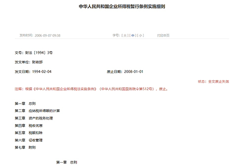 第一條 中華人民共和國境內(nèi)的企業(yè),除外商投資企業(yè)和外國企業(yè)外,應(yīng)當(dāng)就其生產(chǎn)、經(jīng)營所得和其他所得,依照本條例繳納企業(yè)所得稅。 企業(yè)的生產(chǎn)、經(jīng)營所得和其他所得,包括來源于中國境內(nèi)、境外的所得。 第二條 下列實(shí)行獨(dú)立經(jīng)濟(jì)核算的企業(yè)或者組織,為企業(yè)所得稅的納稅義務(wù)人(以下簡稱納稅人): (一)國有企業(yè); (二)集體企業(yè); (三)私營企業(yè); (四)聯(lián)營企業(yè); (五)股份制企業(yè); (六)有生產(chǎn)、經(jīng)營所得和其他所得的其他組織。 第三條 納稅人應(yīng)納稅額,按應(yīng)納稅所得額計(jì)算,稅率為33%。 第四條 納稅人每一納稅年度的收入總額減去準(zhǔn)予扣除項(xiàng)目后的余額為應(yīng)納稅所得額。 第五條 納稅人的收入總額包括: (一)生產(chǎn)、經(jīng)營收入; (二)財(cái)產(chǎn)轉(zhuǎn)讓收入; (三)利息收入; (四)租賃收入; (五)特許權(quán)使用費(fèi)收入; (六)股息收入; (七)其他收入。 第六條 計(jì)算應(yīng)納稅所得額時(shí)準(zhǔn)予扣除的項(xiàng)目,是指與納稅人取得收入有關(guān)的成本、費(fèi)用和損失。 下列項(xiàng)目,按照規(guī)定的范圍、標(biāo)準(zhǔn)扣除: (一)納稅人在生產(chǎn)、經(jīng)營期間,向金融機(jī)構(gòu)借款的利息支出,按照實(shí)際發(fā)生數(shù)扣除;向非金融機(jī)構(gòu)借款的利息支出,不高于按照金融機(jī)構(gòu)同類、同期貸款利率計(jì)算的數(shù)額以內(nèi)的部分,準(zhǔn)予扣除。 (二)納稅人支付給職工的工資,按照計(jì)稅工資扣除。計(jì)稅工資的具體標(biāo)準(zhǔn),在財(cái)政部規(guī)定的范圍內(nèi),由省、自治區(qū)、直轄市人民政府規(guī)定,報(bào)財(cái)政部備案。 (三)納稅人的職工工會(huì)經(jīng)費(fèi)、職工福利費(fèi)、職工教育經(jīng)費(fèi),分別按照計(jì)稅工資總額的2%、14%、1.5%計(jì)算扣除。 (四)納稅人用于公益、救濟(jì)性的捐贈(zèng),在年度應(yīng)納稅所得額3%以內(nèi)的部分,準(zhǔn)予扣除。 除本條第二款規(guī)定外,其他項(xiàng)目,依照法律、行政法規(guī)和國家有關(guān)稅收的規(guī)定扣除。 第七條 在計(jì)算應(yīng)納稅所得額時(shí),下列項(xiàng)目不得扣除: (一)資本性支出; (二)無形資產(chǎn)受讓、開發(fā)支出; (三)違法經(jīng)營的罰款和被沒收財(cái)物的損失; (四)各項(xiàng)稅收的滯納金、罰金和罰款; (五)自然災(zāi)害或者意外事故損失有賠償?shù)牟糠郑?/div> (六)超過國家規(guī)定允許扣除的公益、救濟(jì)性捐贈(zèng),以及非公益、救濟(jì)性的捐贈(zèng); (七)各種贊助支出; (八)與取得收入無關(guān)的其他各項(xiàng)支出。 第八條 對下列納稅人,實(shí)行稅收優(yōu)惠政策: (一)民族自治地方的企業(yè),需要照顧和鼓勵(lì)的,經(jīng)省級人民政府批準(zhǔn),可以實(shí)行定期減稅或者免稅; (二)法律、行政法規(guī)和國務(wù)院有關(guān)規(guī)定給予減稅或者免稅的企業(yè),依照規(guī)定執(zhí)行。 第九條 納稅人在計(jì)算應(yīng)納稅所得額時(shí),其財(cái)務(wù)、會(huì)計(jì)處理辦法同國家有關(guān)稅收的規(guī)定有抵觸的,應(yīng)當(dāng)依照國家有關(guān)稅收的規(guī)定計(jì)算納稅。 第十條 納稅人與其關(guān)聯(lián)企業(yè)之間的業(yè)務(wù)往來,應(yīng)當(dāng)按照獨(dú)立企業(yè)之間的業(yè)務(wù)往來收取或者支付價(jià)款、費(fèi)用。不按照獨(dú)立企業(yè)之間的業(yè)務(wù)往來收取或者支付價(jià)款、費(fèi)用,而減少其應(yīng)納稅所得額的,稅務(wù)機(jī)關(guān)有權(quán)進(jìn)行合理調(diào)整。 第十一條 納稅人發(fā)生年度虧損的,可以用下一納稅年度的所得彌補(bǔ);下一納稅年度的所得不足彌補(bǔ)的,可以逐年延續(xù)彌補(bǔ),但是延續(xù)彌補(bǔ)期最長不得超過五年。 第十二條 納稅人來源于中國境外的所得,已在境外繳納的所得稅稅款,準(zhǔn)予在匯總納稅時(shí),從其應(yīng)納稅額中扣除,但是扣除額不得超過其境外所得依照本條例規(guī)定計(jì)算的應(yīng)納稅額。 第十三條 納稅人依法進(jìn)行清算時(shí),其清算終了后的清算所得,應(yīng)當(dāng)依照本條例規(guī)定繳納企業(yè)所得稅。 第十四條 除國家另有規(guī)定外,企業(yè)所得稅由納稅人向其所在地主管稅務(wù)機(jī)關(guān)繳納。 第十五條 繳納企業(yè)所得稅,按年計(jì)算,分月或者分季預(yù)繳。月份或者季度終了后十五日內(nèi)預(yù)繳,年度終了后四個(gè)月內(nèi)匯算清繳,多退少補(bǔ)。 第十六條 納稅人應(yīng)當(dāng)在月份或者季度終了后十五日內(nèi),向其所在地主管稅務(wù)機(jī)關(guān)報(bào)送會(huì)計(jì)報(bào)表和預(yù)繳所得稅申報(bào)表;年度終了后四十五日內(nèi),向其所在地主管稅務(wù)機(jī)關(guān)報(bào)送會(huì)計(jì)決算報(bào)表和所得稅申報(bào)表。 第十七條 企業(yè)所得稅的征收管理,依照《中華人民共和國稅收征收管理法》及本條例有關(guān)規(guī)定執(zhí)行。 第十八條 金融、保險(xiǎn)企業(yè)繳納企業(yè)所得稅,依照有關(guān)規(guī)定執(zhí)行。 第十九條 本條例由財(cái)政部負(fù)責(zé)解釋,實(shí)施細(xì)則由財(cái)政部制定。 第二十條 本