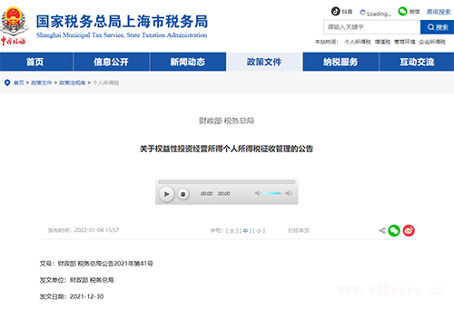 關于權益性投資經(jīng)營所得個人所得稅征收管理的公告 為貫徹落實中央辦公廳、國務院辦公廳《關于進一步深化稅收征管改革的意見》有關要求,深化“放管服”改革,現(xiàn)就權益性投資經(jīng)營所得個人所得稅征收管理有關問題公告如下: 一、持有股權、股票、合伙企業(yè)財產(chǎn)份額等權益性投資的個人獨資企業(yè)、合伙企業(yè)(以下簡稱獨資合伙企業(yè)),一律適用查賬征收方式計征個人所得稅。 二、獨資合伙企業(yè)應自持有上述權益性投資之日起30日內,主動向稅務機關報送持有權益性投資的情況;公告實施前獨資合伙企業(yè)已持有權益性投資的,應當在2022年1月30日前向稅務機關報送持有權益性投資的情況。稅務機關接到核定征收獨資合伙企業(yè)報送持有權益性投資情況的,調整其征收方式為查賬征收。 三、各級財政、稅務部門應做好服務輔導工作,積極引導獨資合伙企業(yè)建立健全賬簿、完善會計核算和財務管理制度、如實申報納稅。獨資合伙企業(yè)未如實報送持有權益性投資情況的,依據(jù)稅收征收管理法相關規(guī)定處理。 四、本公告自2022年1月1日起施行。 特此公告。 財政部 稅務總局 2021年12月30日 |