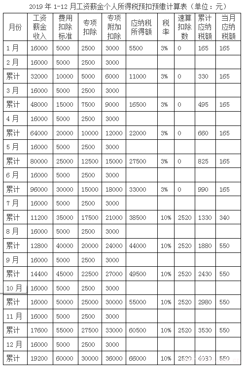 根據(jù)規(guī)定,自2019年1月1日起,居民個(gè)人取得綜合所得,按年計(jì)算個(gè)人所得稅,有扣繳義務(wù)人的,由扣繳義務(wù)人按月或者按次預(yù)扣預(yù)繳稅款。綜合所得,包括工資、薪金所得、勞務(wù)報(bào)酬所得、稿酬所得、特許權(quán)使用費(fèi)所得。居民個(gè)人工資薪金所得適用累計(jì)預(yù)扣法,什么是累計(jì)預(yù)扣法?工資收入如何扣繳個(gè)人所得稅?舉個(gè)例子來說明。 張女士在某企業(yè)任職,2019年1月-12月每月在某企業(yè)取得工資薪金收入16000元,無免稅收入;每月繳納三險(xiǎn)一金2500元,從1月份開始享受子女教育和贍養(yǎng)老人專項(xiàng)附加扣除共計(jì)3000元,無其他扣除。請(qǐng)計(jì)算張女士個(gè)人所得稅預(yù)扣預(yù)繳情況明細(xì)。 在計(jì)算之前我們要了解居民個(gè)人工資、薪金所得應(yīng)納稅額的計(jì)算公式和個(gè)人所得稅預(yù)扣率表。如下: 本期應(yīng)預(yù)扣預(yù)繳稅額=(累計(jì)預(yù)扣預(yù)繳應(yīng)納稅所得額×預(yù)扣率-速算扣除數(shù))-累計(jì)減免稅額-累計(jì)已預(yù)扣預(yù)繳稅額 累計(jì)預(yù)扣預(yù)繳應(yīng)納稅所得額=累計(jì)收入-累計(jì)免稅收入-累計(jì)減除費(fèi)用-累計(jì)專項(xiàng)扣除-累計(jì)專項(xiàng)附加扣除-累計(jì)依法確定的其他扣除 計(jì)算過程: (1)2019年1月 1月累計(jì)預(yù)扣預(yù)繳應(yīng)納稅所得額=累計(jì)收入-累計(jì)免稅收入-累計(jì)減除費(fèi)用-累計(jì)專項(xiàng)扣除-累計(jì)專項(xiàng)附加扣除-累計(jì)依法確定的其他扣除=16000-5000-2500-3000=5500,對(duì)應(yīng)稅率為3%。 1月應(yīng)預(yù)扣預(yù)繳稅額=(累計(jì)預(yù)扣預(yù)繳應(yīng)納稅所得額*預(yù)扣率-速算扣除數(shù))-累計(jì)減免稅額-累計(jì)已預(yù)扣預(yù)繳稅額=5500*3%=165元 2019年1月,企業(yè)在發(fā)放工資環(huán)節(jié)預(yù)扣預(yù)繳個(gè)人所得稅165元。 (2)2019年2月 2月累計(jì)預(yù)扣預(yù)繳應(yīng)納稅所得額=累計(jì)收入-累計(jì)免稅收入-累計(jì)減除費(fèi)用-累計(jì)專項(xiàng)扣除-累計(jì)專項(xiàng)附加扣除-累計(jì)依法確定的其他扣除=16000*2-5000*2-2500*2-3000*2=11000元,對(duì)應(yīng)稅率3%。 2月應(yīng)預(yù)扣預(yù)繳稅額=(累計(jì)預(yù)扣預(yù)繳應(yīng)納稅所得額*預(yù)扣率-速算扣除數(shù))-累計(jì)減免稅額-累計(jì)已預(yù)扣預(yù)繳稅額=11000*3%-165=165元 2019年2月,企業(yè)在發(fā)放工資環(huán)節(jié)預(yù)扣預(yù)繳個(gè)人所得稅165元。 按照上述方法以此類推,計(jì)算得出張女士12個(gè)月的個(gè)人所得稅預(yù)扣預(yù)繳情況明細(xì)表。 你會(huì)計(jì)算工資薪金個(gè)人所得稅預(yù)扣預(yù)繳數(shù)額了么? |