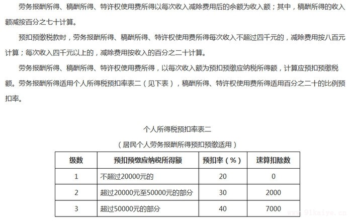 勞務(wù)報酬是個人獨(dú)立從事勞務(wù)取得的報酬,也是需要繳納個稅的,跟工資薪金的計算稅額的方式有所差異,那么勞務(wù)費(fèi)的個人所得稅是怎么算的呢? 勞務(wù)費(fèi)個稅怎么算? 勞務(wù)報酬所得以每次收入減除費(fèi)用后的余額為收入額,勞務(wù)報酬收入不超過4000元,減除費(fèi)用按800元計算;收入超過4000元,減除費(fèi)用按收入的20%計算。勞務(wù)費(fèi)個稅的計算公式為:預(yù)扣稅額=應(yīng)納稅所得額×預(yù)扣率-速算扣除數(shù)。 【1】勞務(wù)報酬不超過800元,預(yù)扣稅額為0元。 【2】勞務(wù)報酬大于800但不超過4000元,假設(shè)取得勞務(wù)報酬4000元,預(yù)扣稅額=(4000-800)×20%=640元。 【3】勞務(wù)報酬大于4000元但不超過20000元,假設(shè)取得勞務(wù)報酬10000元,預(yù)扣稅額=10000×(1-20%)×20%=1600元。 【4】勞務(wù)報酬大于20000元但不超過50000元,假設(shè)取得勞務(wù)報酬40000元,預(yù)扣稅額=40000×(1-20%)×30%-2000=7600元。 【5】勞務(wù)報酬大于50000元,假設(shè)取得勞務(wù)報酬80000元,預(yù)扣稅額=80000×(1-20%)×40%-7000=18600元。 勞務(wù)費(fèi)個稅由扣繳義務(wù)人代為預(yù)扣預(yù)繳,年度終了,納稅人可自行通過個人所得稅APP辦理匯算清繳,多退少補(bǔ)。 以上是玖邀開業(yè)網(wǎng)小編為您整理的關(guān)于勞務(wù)費(fèi)個稅怎么算 附勞務(wù)報酬所得預(yù)扣率表的內(nèi)容,希望對您有所幫助。 |