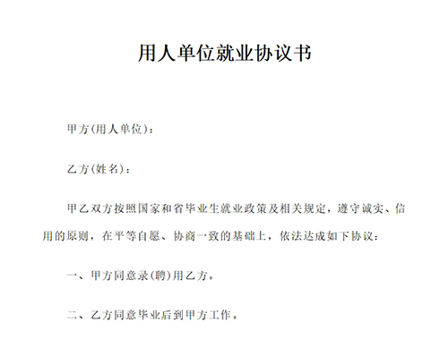 一、什么是《就業(yè)協(xié)議書》 《全國普通高等學(xué)校畢業(yè)生就業(yè)協(xié)議書》的簡(jiǎn)稱,是普通高等學(xué)校畢業(yè)生和用人單位在正式確立勞動(dòng)人事關(guān)系前,經(jīng)雙向選擇,在規(guī)定期限內(nèi)確立就業(yè)關(guān)系、明確雙方權(quán)利和義務(wù)而達(dá)成的書面協(xié)議,是用人單位確認(rèn)畢業(yè)生相關(guān)信息真實(shí)可靠以及接收畢業(yè)生的重要憑據(jù),也是高校進(jìn)行畢業(yè)生就業(yè)管理、編制就業(yè)方案以及畢業(yè)生辦理就業(yè)落戶手續(xù)等有關(guān)事項(xiàng)的重要依據(jù)。協(xié)議在畢業(yè)生到單位報(bào)到、用人單位正式接收后自行終止。就業(yè)協(xié)議一般由國家教育部或各省、市、自治區(qū)就業(yè)主管部門統(tǒng)一制表。 就業(yè)協(xié)議與勞動(dòng)合同是用人單位錄用畢業(yè)生時(shí)所訂立的書面協(xié)議,但兩者分處兩個(gè)相互聯(lián)系的不同階段: 1、畢業(yè)生就業(yè)協(xié)議是畢業(yè)生在校時(shí),由學(xué)校參與見證的,與用人單位協(xié)商簽訂的,是編制畢業(yè)生就業(yè)計(jì)劃方案和畢業(yè)生派遣的依據(jù)。勞動(dòng)合同是畢業(yè)生與用人單位明確勞動(dòng)關(guān)系中權(quán)利義務(wù)關(guān)系的協(xié)議,學(xué)校不是勞動(dòng)合同的主體,也不是勞動(dòng)合同的見證方,勞動(dòng)合同是上崗畢業(yè)生從事何種崗位、享受何種待遇等權(quán)利和義務(wù)的依據(jù)。 2、畢業(yè)生就業(yè)協(xié)議的內(nèi)容主要是畢業(yè)生如實(shí)介紹自身情況,并表示愿意到用人單位就業(yè)、用人單位表示愿意接收畢業(yè)生,學(xué)校同意推薦畢業(yè)生并列入就業(yè)計(jì)劃進(jìn)行派遣。勞動(dòng)合同的內(nèi)容涉及勞動(dòng)報(bào)酬、勞動(dòng)保護(hù)、工作內(nèi)容、勞動(dòng)紀(jì)律等方方面面,更為具體.勞動(dòng)權(quán)利義務(wù)更為明確。 3、一般來說就業(yè)協(xié)議簽訂在前,勞動(dòng)合同訂立在后,如果畢業(yè)生與用人單位就工資待遇、住房等有事先約定,亦可在就業(yè)協(xié)議備注條款中予以注明,日后訂立勞動(dòng)合同對(duì)此內(nèi)容應(yīng)予認(rèn)可。 4、就業(yè)協(xié)議是畢業(yè)生和用人單位關(guān)于將來就業(yè)意向的初步約定,對(duì)于雙方的基本條件以及即將簽訂勞動(dòng)合同的部分基本內(nèi)容大體認(rèn)可,并經(jīng)用人單位的上級(jí)主管部門,高校畢業(yè)生和用人單位簽字蓋章承諾履行協(xié)議,高校不作為第三方。高校只在“有關(guān)信息及意見”一欄填寫(或制作長(zhǎng)條章加蓋)學(xué)校的聯(lián)系電話、郵箱、郵寄地址及相關(guān)意見等信息。一經(jīng)畢業(yè)生、用人單位、高校、用人單位主管部門簽字蓋章,即具有一定的法律效應(yīng),是編制畢業(yè)生的就業(yè)計(jì)劃和將來可能發(fā)生違約情況時(shí)的判斷依據(jù)。 5、現(xiàn)實(shí)中就業(yè)協(xié)議存在的尷尬現(xiàn)象,必須先簽訂就業(yè)協(xié)議,學(xué)校才發(fā)畢業(yè)證的現(xiàn)象(不簽三方,不發(fā)畢業(yè)證)。這樣,就業(yè)協(xié)議不是畢業(yè)生和用人單位關(guān)于將來就業(yè)意向的初步約定,而是未畢業(yè)生和用人單位關(guān)于將來就業(yè)意向的初步約定。 二、就業(yè)協(xié)議的主要內(nèi)容 (一)《就業(yè)協(xié)議書》的基本內(nèi)容 (1)高校畢業(yè)生基本情況,應(yīng)包括:姓名、性別、身份證號(hào)、專業(yè)、學(xué)制、畢業(yè)時(shí)間、學(xué)歷、聯(lián)系方式等。 (2)用人單位基本情況,應(yīng)包括:?jiǎn)挝幻Q、組織機(jī)構(gòu)代碼、單位性質(zhì)、聯(lián)系人及聯(lián)系方式、檔案接收地等。 (3)高校畢業(yè)生和用人單位約定的有關(guān)內(nèi)容,可包括:工作地點(diǎn)及工作崗位;戶口遷入地;違約責(zé)任;協(xié)議自動(dòng)失效條款、協(xié)議終止條款;雙方約定的其他事宜。 (4)各方應(yīng)嚴(yán)格履行協(xié)議,任何一方若違反協(xié)議,應(yīng)承擔(dān)違約責(zé)任。 (5)其他補(bǔ)充協(xié)議。 (二)就業(yè)協(xié)議協(xié)議包括 由甲方(用人單位)和乙方(高校畢業(yè)生),同意簽訂如下協(xié)議: (1) 甲方應(yīng)如實(shí)向乙方介紹情況,經(jīng)了解,同意接受乙方,并負(fù)責(zé)有關(guān)接受手續(xù)。 (2) 乙方應(yīng)如實(shí)向甲方介紹情況,同意到甲方工作,服從甲方的工作安排。 (4)甲乙雙方如有其他約定,應(yīng)在備注欄明確,并視為本協(xié)議書的一部分。 (5)雙方中有一方要變動(dòng)協(xié)議,須提前一個(gè)月征得對(duì)方的同意,否則按違約處理。 (6)本協(xié)議一式三份,分別由甲方、乙方和學(xué)校就業(yè)工作部門留存,復(fù)印件無效。 (7)就業(yè)協(xié)議書由各省級(jí)高校畢業(yè)生就業(yè)工作主管部門或高等學(xué)校印制,由高等學(xué)校統(tǒng)一發(fā)放給畢業(yè)生。 三、就業(yè)協(xié)議的注意事項(xiàng) 須注意的是學(xué)校同意蓋章這一步一定要最后執(zhí)行以保護(hù)學(xué)生的權(quán)益高校畢業(yè)生就業(yè)必須由畢業(yè)生、用人單位和學(xué)校簽署就業(yè)協(xié)議書。就業(yè)協(xié)議書一式三份,畢業(yè)生、用人單位和學(xué)校各執(zhí)一份。就業(yè)協(xié)議書