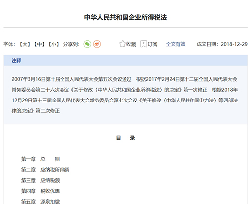 (2007年3月16日第十屆全國(guó)人民代表大會(huì)第五次會(huì)議通過(guò) 根據(jù)2017年2月24日第十二屆全國(guó)人民代表大會(huì)常務(wù)委員會(huì)第二十六次會(huì)議《關(guān)于修改〈中華人民共和國(guó)企業(yè)所得稅法〉的決定》第一次修正 根據(jù)2018年12月29日第十三屆全國(guó)人民代表大會(huì)常務(wù)委員會(huì)第七次會(huì)議《關(guān)于修改〈中華人民共和國(guó)電力法〉等四部法律的決定》第二次修正) 目 錄 第一章 總 則 第二章 應(yīng)納稅所得額 第三章 應(yīng)納稅額 第四章 稅收優(yōu)惠 第五章 源泉扣繳 第六章 特別納稅調(diào)整 第七章 征收管理 第八章 附 則 第一章 總 則 第一條 在中華人民共和國(guó)境內(nèi),企業(yè)和其他取得收入的組織(以下統(tǒng)稱企業(yè))為企業(yè)所得稅的納稅人,依照本法的規(guī)定繳納企業(yè)所得稅。 個(gè)人獨(dú)資企業(yè)、合伙企業(yè)不適用本法。 第二條 企業(yè)分為居民企業(yè)和非居民企業(yè)。 本法所稱居民企業(yè),是指依法在中國(guó)境內(nèi)成立,或者依照外國(guó)(地區(qū))法律成立但實(shí)際管理機(jī)構(gòu)在中國(guó)境內(nèi)的企業(yè)。 本法所稱非居民企業(yè),是指依照外國(guó)(地區(qū))法律成立且實(shí)際管理機(jī)構(gòu)不在中國(guó)境內(nèi),但在中國(guó)境內(nèi)設(shè)立機(jī)構(gòu)、場(chǎng)所的,或者在中國(guó)境內(nèi)未設(shè)立機(jī)構(gòu)、場(chǎng)所,但有來(lái)源于中國(guó)境內(nèi)所得的企業(yè)。 第三條 居民企業(yè)應(yīng)當(dāng)就其來(lái)源于中國(guó)境內(nèi)、境外的所得繳納企業(yè)所得稅。 非居民企業(yè)在中國(guó)境內(nèi)設(shè)立機(jī)構(gòu)、場(chǎng)所的,應(yīng)當(dāng)就其所設(shè)機(jī)構(gòu)、場(chǎng)所取得的來(lái)源于中國(guó)境內(nèi)的所得,以及發(fā)生在中國(guó)境外但與其所設(shè)機(jī)構(gòu)、場(chǎng)所有實(shí)際聯(lián)系的所得,繳納企業(yè)所得稅。 非居民企業(yè)在中國(guó)境內(nèi)未設(shè)立機(jī)構(gòu)、場(chǎng)所的,或者雖設(shè)立機(jī)構(gòu)、場(chǎng)所但取得的所得與其所設(shè)機(jī)構(gòu)、場(chǎng)所沒(méi)有實(shí)際聯(lián)系的,應(yīng)當(dāng)就其來(lái)源于中國(guó)境內(nèi)的所得繳納企業(yè)所得稅。 第四條 企業(yè)所得稅的稅率為25%。 非居民企業(yè)取得本法第三條第三款規(guī)定的所得,適用稅率為20%。 第二章 應(yīng)納稅所得額 第五條 企業(yè)每一納稅年度的收入總額,減除不征稅收入、免稅收入、各項(xiàng)扣除以及允許彌補(bǔ)的以前年度虧損后的余額,為應(yīng)納稅所得額。 第六條 企業(yè)以貨幣形式和非貨幣形式從各種來(lái)源取得的收入,為收入總額。包括: (一)銷售貨物收入; (二)提供勞務(wù)收入; (三)轉(zhuǎn)讓財(cái)產(chǎn)收入; (四)股息、紅利等權(quán)益性投資收益; (五)利息收入; (六)租金收入; (七)特許權(quán)使用費(fèi)收入; (八)接受捐贈(zèng)收入; (九)其他收入。 第七條 收入總額中的下列收入為不征稅收入: (一)財(cái)政撥款; (二)依法收取并納入財(cái)政管理的行政事業(yè)性收費(fèi)、政府性基金; (三)國(guó)務(wù)院規(guī)定的其他不征稅收入。 第八條 企業(yè)實(shí)際發(fā)生的與取得收入有關(guān)的、合理的支出,包括成本、費(fèi)用、稅金、損失和其他支出,準(zhǔn)予在計(jì)算應(yīng)納稅所得額時(shí)扣除。 第九條 企業(yè)發(fā)生的公益性捐贈(zèng)支出,在年度利潤(rùn)總額12%以內(nèi)的部分,準(zhǔn)予在計(jì)算應(yīng)納稅所得額時(shí)扣除;超過(guò)年度利潤(rùn)總額12%的部分,準(zhǔn)予結(jié)轉(zhuǎn)以后三年內(nèi)在計(jì)算應(yīng)納稅所得額時(shí)扣除。 第十條 在計(jì)算應(yīng)納稅所得額時(shí),下列支出不得扣除: (一)向投資者支付的股息、紅利等權(quán)益性投資收益款項(xiàng); (二)企業(yè)所得稅稅款; (三)稅收滯納金; (四)罰金、罰款和被沒(méi)收財(cái)物的損失; (五)本法第九條規(guī)定以外的捐贈(zèng)支出; (六)贊助支出; (七)未經(jīng)核定的準(zhǔn)備金支出; (八)與取得收入無(wú)關(guān)的其他支出。 第十一條 在計(jì)算應(yīng)納稅所得額時(shí),企業(yè)按照規(guī)定計(jì)算的固定資產(chǎn)折舊,準(zhǔn)予扣除。 下列固定資產(chǎn)不得計(jì)算折舊扣除: (一)房屋、建筑物以外未投入使用的固定資產(chǎn); (二)以經(jīng)營(yíng)租賃方式租入的固定資產(chǎn); (三)以融資租賃方式租出的固定資產(chǎn); (四)已足額提取折舊仍繼續(xù)使用的固定資產(chǎn); (五)與經(jīng)營(yíng)活動(dòng)無(wú)關(guān)的固定資產(chǎn); (六)單獨(dú)估價(jià)作為固定資產(chǎn)入賬的土地; (七)其他不得計(jì)算折舊扣除的固定資產(chǎn)。 第十二條 在計(jì)算應(yīng)納稅所得額時(shí),企業(yè)按照規(guī)定計(jì)算的無(wú)形資產(chǎn)攤銷費(fèi)用,準(zhǔn)予扣除。 下列無(wú)形資產(chǎn)不得計(jì)算攤銷費(fèi)用扣除: (一)自行開(kāi)發(fā)的支出已在計(jì)算應(yīng)納稅所得額時(shí)扣除的無(wú)形資產(chǎn); (二)自創(chuàng)商譽(yù); (三)與經(jīng)營(yíng)活動(dòng)無(wú)關(guān)的無(wú)形資產(chǎn); (四)其他不得計(jì)算攤銷費(fèi)用扣除的無(wú)形資產(chǎn)