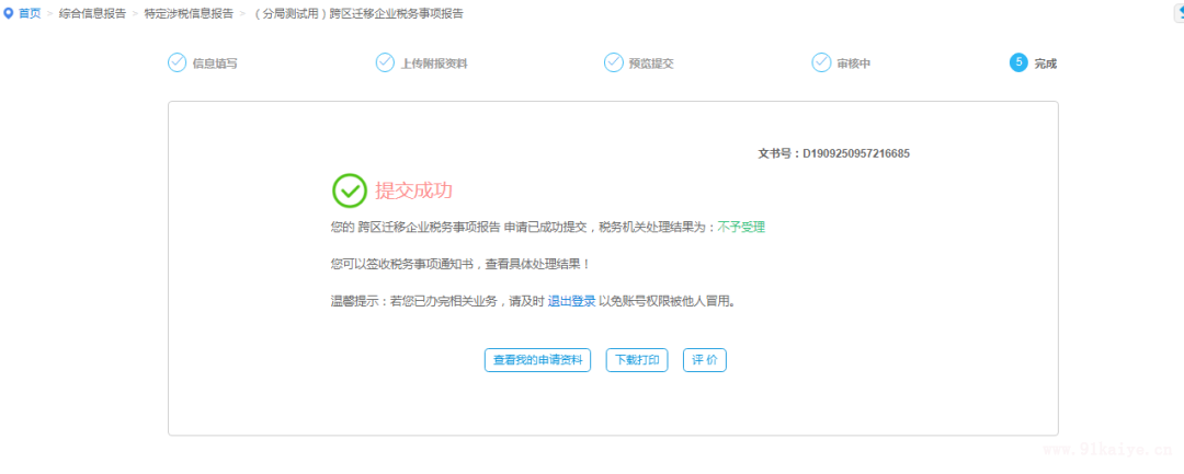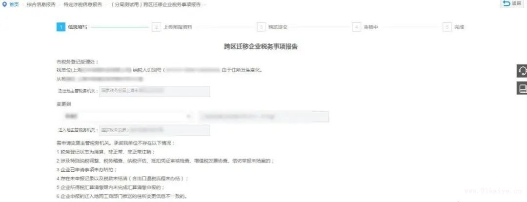 公司因發(fā)展需要,從A區(qū)搬到B區(qū),仍在本市經(jīng)營。但由于工商注冊地行政區(qū)劃變更,現(xiàn)在怎么變更主管稅務(wù)機(jī)關(guān)?還需要辦理清稅注銷嗎? 業(yè)務(wù)前提 跨區(qū)遷移企業(yè)稅務(wù)事項報告所需要的前提條件: 1.納稅人狀態(tài)為正常; 2.課征主體登記類型為單位納稅人稅務(wù)登記; 3.不存在重復(fù)辦理的事項 功能節(jié)點 電子稅務(wù)局——我要辦稅——綜合信息報告——特定涉稅信息報告——跨區(qū)遷移企業(yè)稅務(wù)事項報告 操作步驟 登錄電子稅務(wù)局,點擊首頁菜單欄中“我要辦稅”中的“綜合信息報告”菜單 點擊“特定涉稅信息報告”欄中的“跨區(qū)遷移企業(yè)稅務(wù)事項報告”進(jìn)入辦理頁面。 第一步:點擊跨區(qū)遷移企業(yè)稅務(wù)事項報告,填寫表單 1. 默認(rèn)自動帶出當(dāng)前外部門信息交換中工商地址的信息,作為將要變更的遷入地的行政區(qū)劃和填寫注冊地址。如您已變更注冊地址,跨區(qū)遷移前后注冊地址可能一致,請確認(rèn)遷出地、遷入地主管稅務(wù)機(jī)關(guān)信息正確即可。 目前電子稅務(wù)局跨區(qū)遷移企業(yè)稅務(wù)事項報告僅支持企業(yè)遷入地與外部門信息傳遞一致的情形,如您實際遷入地與系統(tǒng)帶出信息不一致,可由已通過實名認(rèn)證的辦稅人員,攜帶營業(yè)執(zhí)照原件、辦稅人員本人身份證件原件、企業(yè)公章,前往市稅務(wù)登記受理處現(xiàn)場辦理。 2.選擇經(jīng)辦人(證件號碼和聯(lián)系電話自動帶出)。 3.點擊提交系統(tǒng)會對當(dāng)前納稅人所有的指標(biāo)進(jìn)行校驗,請耐心等待。 若存在指標(biāo)校驗未通過的情況,點擊指標(biāo)校驗不通過頁面的【我知道了】,會跳轉(zhuǎn)到完成頁面,稅務(wù)機(jī)關(guān)處理結(jié)果為:“不予受理”,可以下載打印不予受理通知書。 若指標(biāo)校驗成功,進(jìn)入第二步。 第二步:上傳附報資料 注:該事項無需上傳附報資料,直接點擊下一步。 第三步:提交預(yù)覽 點擊提交,進(jìn)行確認(rèn)提交 第四步:審核簽名 確認(rèn)上述需要申領(lǐng)的發(fā)票信息無誤后輸入CA密碼進(jìn)行數(shù)字簽名。 插入CA證書,輸入正確的CA密碼,點擊[驗證]按鈕繼續(xù)操作。 第五步:提交成功。 等待3-5分鐘后點擊“辦稅進(jìn)度及結(jié)果查詢”中查看事項進(jìn)度 下載打。 點擊查看后,下載打印,可以查看相應(yīng)的通知書 1. 稅務(wù)事項通知書 2. 稅務(wù)事項報告 至此事項辦理結(jié)束。 |