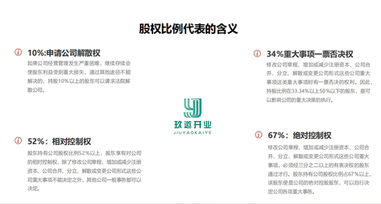 不同股權比例對應的股東權利有哪些?股權是股東利益最直接的體現(xiàn),持有一定的股權比例意味著股東在特定事項上享有特定的權利,可以在不同程度上對公司的發(fā)展或者決策起到不同的作用。 1、67%:絕對控制權 股東會會議做出修改公司章程、增加或者減少注冊資本的決議,以及公司合并、分立、解散或者變更公司形式的決議,必須經代表三分之二以上表決權的股東通過。 持有公司2/3以上股權的,意味著可以決定股東會決議的全部事項。 2、51%:相對控制權 如公司章程無特殊規(guī)定,股東會會議由股東按照出資比例行使表決權,持有公司二分之一以上股權,即可以決定除絕對控制權所涉特殊事項以外的全部事項。 3、34%:自我保護權 雖然不能決定股東會的一般事項,但是可以決定公司是否能夠修改公司章程、增加或者減少注冊資本的決議,以及公司合并、分立、解散或者變更公司形式等特殊事項。 4、10%:股東會議召集和主持權 代表十分之一以上表決權的股東,提議召開臨時會議的,應當召開臨時會議。 董事會或者執(zhí)行董事不能履行或者不履行召集股東會會議職責的,由監(jiān)事會或者不設監(jiān)事會的公司的監(jiān)事召集和主持;監(jiān)事會或者監(jiān)事不召集和主持的,代表十分之一以上表決權的股東可以自行召集和主持。 5、3%:股份公司臨時提案權 單獨或者合計持有公司百分之三以上股份的股東,可以在股東大會召開十日前提出臨時提案并書面提交董事會;董事會應當在收到提案后二日內通知其他股東,并將該臨時提案提交股東大會審議。臨時提案的內容應當屬于股東大會職權范圍,并有明確議題和具體決議事項。 6、1%:股東代位訴訟權 董事、高級管理人員執(zhí)行公司職務時違反法律、行政法規(guī)或者公司章程的規(guī)定,給公司造成損失的,有限責任公司的股東、股份有限公司連續(xù)一百八十日以上單獨或者合計持有公司百分之一以上股份的股東,可以書面請求監(jiān)事會或者不設監(jiān)事會的有限責任公司的監(jiān)事向人民法院提起訴訟; 監(jiān)事執(zhí)行公司職務時違反法律、行政法規(guī)或者公司章程的規(guī)定,給公司造成損失的,前述股東可以書面請求董事會或者不設董事會的有限責任公司的執(zhí)行董事向人民法院提起訴訟。 監(jiān)事會、不設監(jiān)事會的有限責任公司的監(jiān)事,或者董事會、執(zhí)行董事收到前款規(guī)定的股東書面請求后拒絕提起訴訟,或者自收到請求之日起三十日內未提起訴訟,或者情況緊急、不立即提起訴訟將會使公司利益受到難以彌補的損害的,前述股東有權為了公司的利益以自己的名義直接向人民法院提起訴訟。 他人侵犯公司合法權益,給公司造成損失的,前述股東可以依照前兩款的規(guī)定向人民法院提起訴訟。 |