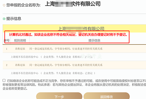 第一步:打開上海一窗通辦,點(diǎn)擊我要開辦企業(yè) 網(wǎng)址:https://yct.sh.gov.cn/portal_yct/ 第二步:選擇企業(yè)開辦不涉及前置審批事項(xiàng)的如圖 第三步:輸入名稱字號,選擇行業(yè)表述以及組織形式 如:上海(行政區(qū)劃)+玖邀開業(yè)(字號)+信息科技(行業(yè))+有限公司(組織形式) 。 第四步:查看結(jié)果 出現(xiàn)計算機(jī)比對通過,說明公司名稱通過的概率90%以上,出現(xiàn)禁用詞,說明公司名稱不可用,出現(xiàn)計算機(jī)對比不通過,通過的概率非常低,如果自己又特別喜歡這個名稱,可以通過走特殊渠道的形勢來獲。ň唧w咨詢玖邀開業(yè)官方客服)。 以上是玖邀開業(yè)網(wǎng)小編為您整理的關(guān)于如何辦理公司名稱核準(zhǔn)的內(nèi)容,希望對您有所幫助。 |