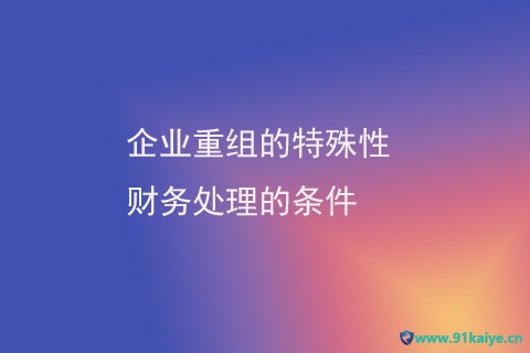 : 企業(yè)重組的特殊性財務處理條件1、具有合理的商務目標,且不以減少,免除或推遲繳納稅款為主要目的;2、被收購、合并或分立部分的資產(chǎn)或股權比例符合規(guī)定的比例;(50%)3、企業(yè)重組后的連續(xù)12個月內部改變重組資產(chǎn)原 ...