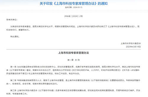 為加快建設具有全球影響力的科技創(chuàng)新中心,深化科技管理改革,完善評審專家的選取和使用,提高決策的科學化水平,落實《中共中央辦公廳 國務院辦公廳關于深化項目評審、人才評價、機構評估改革的意見》(中辦發(fā)〔2018〕37號),推進上海市科技專家?guī)欤ㄒ韵潞喎Q“專家?guī)臁保┙ㄔO,上海市科學技術委員會(以下簡稱“市科委”)研究制定了《上海市科技專家?guī)旃芾磙k法》(以下簡稱《辦法》)。政策解讀如下: 一、 編制背景 專家?guī)旆⻊沼谏虾J锌萍脊芾恚谔嵘萍脊芾硭、?yōu)化科技資源配置、促進科技事業(yè)發(fā)展方面起到重要作用,對科技管理部門提升科技決策水平和科技創(chuàng)新能力具有重要意義。2018年底市科委發(fā)布《上海市科技專家?guī)旃芾磙k法(試行)》以來,對規(guī)范專家?guī)旖ㄔO、管理和專家選取使用發(fā)揮了積極作用。為持續(xù)改進完善專家?guī)旖ㄔO,市科委對專家?guī)旖ㄔO管理、專家選取和使用等相關舉措做了進一步完善,制定了新的《辦法》。 二、 主要內(nèi)容 《辦法》共四章十八條,分別從目的依據(jù)、適用范圍、專家入庫、專家更新、專家出庫、專家選取與使用等方面進行了規(guī)定。 1、 關于“第一章 總則”。明確了《辦法》制定的背景、目的、原則及適用范圍。規(guī)定市科委在科技管理中所需專家,均應當按照本辦法要求從專家?guī)熘羞x取使用。 2、 關于“第二章 專家?guī)旖ㄔO與管理”。對專家入庫標準及入庫流程、專家信息更新、專家出庫情形、推薦單位責任等做了相應規(guī)定。專家入庫條件重能力、重貢獻,有突出成果、突出貢獻、豐富實踐經(jīng)驗的人員,可適當放寬條件。為提高專家信息有效性,《辦法》明確入庫專家應當及時更新信息,推薦單位應當認真履行專家推薦和管理職責。 3、 關于“第三章 專家選取與使用”。明確專家隨機抽取、同行評議、輪換、誠信、回避等原則,并對專家申請回避及誠信承諾、評審專家名單公開、專家評價等做了相應規(guī)定。 |