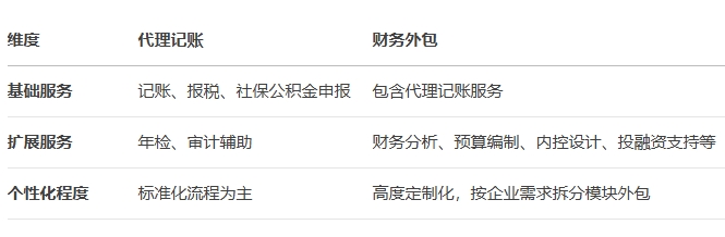 代理記賬和財(cái)務(wù)外包在服務(wù)定位、適用場(chǎng)景及核心目標(biāo)上存在顯著差異,以下是兩者的詳細(xì)對(duì)比: 1. 定義與核心職能 - 代理記賬 以基礎(chǔ)財(cái)稅合規(guī)為核心,主要為中小企業(yè)提供記賬、報(bào)稅、報(bào)表編制等基礎(chǔ)服務(wù),確保企業(yè)符合稅法及會(huì)計(jì)準(zhǔn)則要求。 核心目標(biāo):解決企業(yè)“賬稅合規(guī)”問題,避免稅務(wù)風(fēng)險(xiǎn)。 - 財(cái)務(wù)外包 覆蓋更廣泛的財(cái)務(wù)管理需求,可定制化外包部分或全部財(cái)務(wù)職能(如成本控制、預(yù)算分析、資金管理等),注重效率優(yōu)化與戰(zhàn)略支持。 核心目標(biāo):通過專業(yè)化分工提升財(cái)務(wù)管理水平,助力企業(yè)降本增效或戰(zhàn)略決策。 2. 服務(wù)范圍對(duì)比 3. 適用對(duì)象差異 - 代理記賬 典型用戶:初創(chuàng)公司、小微企業(yè)、個(gè)體工商戶。 需求場(chǎng)景:無專職會(huì)計(jì)團(tuán)隊(duì),需以低成本滿足法定財(cái)稅申報(bào)義務(wù)。 - 財(cái)務(wù)外包 典型用戶: - 中型企業(yè):財(cái)務(wù)團(tuán)隊(duì)人力不足,需外包部分模塊(如成本核算); - 集團(tuán)企業(yè):剝離非核心職能(如分公司賬務(wù)處理); - 高速成長(zhǎng)期企業(yè):需專業(yè)財(cái)務(wù)分析支持決策(如現(xiàn)金流預(yù)測(cè))。 4. 服務(wù)模式與成本 - 代理記賬 - 收費(fèi)模式:固定月費(fèi)(通常數(shù)百至數(shù)千元,按企業(yè)規(guī)模浮動(dòng)); - 合作形式:長(zhǎng)期固定服務(wù),按月/季度交付報(bào)表。 - 財(cái)務(wù)外包 - 收費(fèi)模式:按項(xiàng)目或模塊定價(jià)(如單次財(cái)務(wù)分析報(bào)告、年度預(yù)算外包); - 靈活性:可短期合作(如融資前的財(cái)務(wù)合規(guī)梳理)或長(zhǎng)期外包特定職能。 5. 風(fēng)險(xiǎn)與責(zé)任 - 代理記賬 責(zé)任明確集中于合規(guī)性風(fēng)險(xiǎn)(如漏報(bào)稅導(dǎo)致的罰款),代理方需承擔(dān)主要責(zé)任。 - 財(cái)務(wù)外包 風(fēng)險(xiǎn)擴(kuò)展至決策影響(如預(yù)算偏差導(dǎo)致資金鏈問題),需通過合同明確權(quán)責(zé),可能涉及風(fēng)險(xiǎn)共擔(dān)條款。 6. 選擇建議 - 選代理記賬:若企業(yè)核心需求僅為“合法存續(xù)”,無需深度財(cái)務(wù)分析。 示例:電商小微店主,月流水20萬元,只需合規(guī)申報(bào)增值稅及個(gè)稅。 - 選財(cái)務(wù)外包:若企業(yè)面臨復(fù)雜財(cái)務(wù)問題(如多分支機(jī)構(gòu)核算、成本優(yōu)化需求)。 示例:連鎖餐飲企業(yè),需統(tǒng)一各門店成本核算標(biāo)準(zhǔn)并優(yōu)化供應(yīng)鏈資金周轉(zhuǎn)。 總結(jié) 代理記賬是財(cái)務(wù)外包的“基礎(chǔ)版”,而財(cái)務(wù)外包更像“進(jìn)階版”。隨著企業(yè)發(fā)展,可能從代理記賬升級(jí)至財(cái)務(wù)外包,甚至引入CFO顧問服務(wù)。選擇時(shí)需評(píng)估自身發(fā)展階段、管理復(fù)雜度及戰(zhàn)略需求,而非單純比較成本。 |