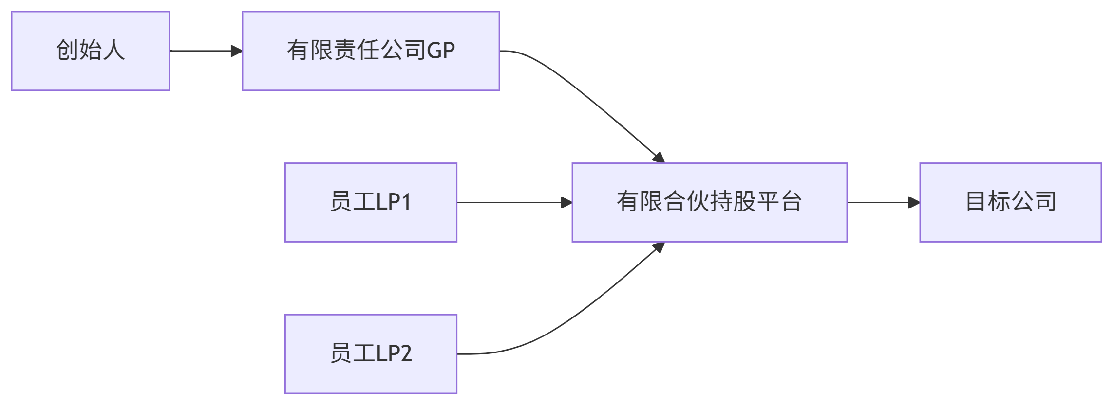 - 說明:創(chuàng)始人通過有限責(zé)任公司控制GP,員工作為LP通過合伙企業(yè)間接持股目標(biāo)公司,避免直接工商變更的繁瑣。