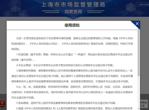 上海市企業(yè)登記檔案查閱辦法 第一條(目的) 為了充分發(fā)揮企業(yè)登記檔案的社會(huì)作用,根據(jù)《中華人民共和國檔案法》、《中華人民共和國公司法》、《中華人民共和國保密法》和《上海市檔案條例》等有關(guān)法律法規(guī),制定本辦法。 第二條(定義) 本辦法所稱的企業(yè)登記檔案是指本市市場(chǎng)監(jiān)管部門依法對(duì)企業(yè)進(jìn)行登記、管理過程中形成的材料。其中對(duì)企業(yè)登記檔案進(jìn)行摘編所形成的材料,稱之為企業(yè)登記基本資料檔案。 第三條(實(shí)施部門及職責(zé)) 上海市工商行政管理局檔案室和各區(qū)市場(chǎng)監(jiān)管局檔案室具體開展企業(yè)登記檔案的查閱利用工作。 上海市工商行政管理局信息中心負(fù)責(zé)企業(yè)登記網(wǎng)上電子化檔案查閱的相關(guān)技術(shù)支持和保障工作。 第四條(查閱方式) 本市企業(yè)登記檔案通過計(jì)算機(jī)系統(tǒng)采取電子化查閱的方法。除需要鑒定字跡或印鑒外,不再提供紙質(zhì)原件進(jìn)行查閱。 第五條(企業(yè)登記檔案的類別和內(nèi)容) (一)企業(yè)登記基本資料檔案。包括:企業(yè)名稱、公司注冊(cè)號(hào)、住所/營業(yè)場(chǎng)所、法定代表人/負(fù)責(zé)人姓名、注冊(cè)資本/金、出資方式、經(jīng)營范圍、公司類型/經(jīng)濟(jì)性質(zhì)、企業(yè)狀態(tài)、營業(yè)期限/經(jīng)營期限、登記機(jī)關(guān)/受理機(jī)關(guān)、成立日期、最新年檢狀況、股東/發(fā)起人姓名或名稱等。 (二)企業(yè)登記電子化檔案。 1.企業(yè)開業(yè)登記材料:名稱預(yù)先核準(zhǔn)通知書、企業(yè)設(shè)立登記申請(qǐng)書、章程、合同、委派書、聘任書、房屋租賃協(xié)議、董事會(huì)(股東會(huì)、監(jiān)事會(huì))決議等。 2.企業(yè)變更登記材料:企業(yè)名稱、住所、法定代表人、經(jīng)濟(jì)性質(zhì)或企業(yè)類別、注冊(cè)資本、經(jīng)營范圍等變更登記材料。 3.企業(yè)注銷登記材料:注銷登記申請(qǐng)書、股東會(huì)或董事會(huì)的決議或決定、核準(zhǔn)注銷通知書等。 4.企業(yè)吊銷材料:行政處罰決定書、公告等。 5.監(jiān)督管理材料:企業(yè)限期整改等日常監(jiān)管材料。 第六條(企業(yè)登記基本資料檔案的查閱對(duì)象) 單位和社會(huì)公眾可以查閱企業(yè)登記基本資料檔案。 第七條(企業(yè)登記電子化檔案的查閱對(duì)象) 下列對(duì)象可以查閱除基本資料檔案以外的其他部分企業(yè)登記電子化檔案: (一)各級(jí)公安機(jī)關(guān)、檢察機(jī)關(guān)、審判機(jī)關(guān)、國家安全機(jī)關(guān)、紀(jì)檢監(jiān)察機(jī)關(guān)和審計(jì)機(jī)關(guān),可以查閱與自身所處理案件相關(guān)的企業(yè)登記檔案。 (二)受當(dāng)事人委托的律師、基層法律服務(wù)工作者和法律援助機(jī)構(gòu)人員可以查閱與其辦理事項(xiàng)相關(guān)的企業(yè)登記檔案。 (三)公證、仲裁、鑒定等機(jī)構(gòu)可以查閱與其工作內(nèi)容相關(guān)的企業(yè)登記檔案。 (四)企業(yè)可以查閱本企業(yè)的登記檔案。 (五)其他有關(guān)單位因工作關(guān)系需查閱企業(yè)登記檔案的,需經(jīng)檔案所屬機(jī)關(guān)檔案管理部門負(fù)責(zé)人同意方可查閱相關(guān)檔案。 第八條(查閱企業(yè)登記基本資料檔案需要履行的手續(xù)) 查閱企業(yè)登記基本資料檔案,需填寫查檔申請(qǐng)表,并提供本人的有效身份證件。 第九條(查閱企業(yè)登記電子化檔案需要履行的手續(xù)) 本辦法第七條所列人員查閱除基本資料檔案以外的其他企業(yè)登記檔案,需填寫查檔申請(qǐng)表,提交單位出具的注明擬查閱企業(yè)全稱的有效證明并出示查閱人的相關(guān)有效證件,供檔案工作人員查驗(yàn)。 (一)公安機(jī)關(guān)、檢察機(jī)關(guān)、審判機(jī)關(guān)、國家安全機(jī)關(guān)、紀(jì)檢監(jiān)察機(jī)關(guān)和審計(jì)機(jī)關(guān),應(yīng)當(dāng)由其指定的查閱人提交所在機(jī)關(guān)出具的有效證明并出示本人的有效工作證件。 (二)律師應(yīng)當(dāng)提交所在單位出具的證明并出示本人的律師執(zhí)業(yè)證件;鶎臃煞⻊(wù)工作者應(yīng)當(dāng)提交所在單位出具的證明并出示本人的工作證。法律援助人員應(yīng)當(dāng)提交法律援助機(jī)構(gòu)的指派通知書、介紹信并出示本人有效工作證件。 (三)公證、仲裁等機(jī)構(gòu)工作人員應(yīng)當(dāng)提交所在機(jī)構(gòu)出具的有效證明并出示本人的有效執(zhí)業(yè)證件。 (四)鑒定等機(jī)構(gòu)工作人員應(yīng)當(dāng)提供有關(guān)單位委托其鑒定的委托書,提交所在機(jī)構(gòu)出具的有效證明,出示本人的有效執(zhí)業(yè)證件。 (五)企業(yè)查閱本企業(yè)的登記檔案,應(yīng)當(dāng)提交本企業(yè)出具的說明查檔用途的有效介紹信,并出示本企業(yè)有效的營業(yè)執(zhí)照(正本或副本)原件及指定查閱人員的有效身份證件。 第十條(特殊企業(yè)登記檔案的利用) 凡涉及特殊企業(yè)的登記檔案,按《保密法》有關(guān)規(guī)定,履行相關(guān)手續(xù)后,方可提供查閱利用。 第十一條(查閱場(chǎng)地及對(duì)利用者的要求) 查閱企業(yè)登記電子化檔案應(yīng)在市場(chǎng)監(jiān)管部門檔案室指定