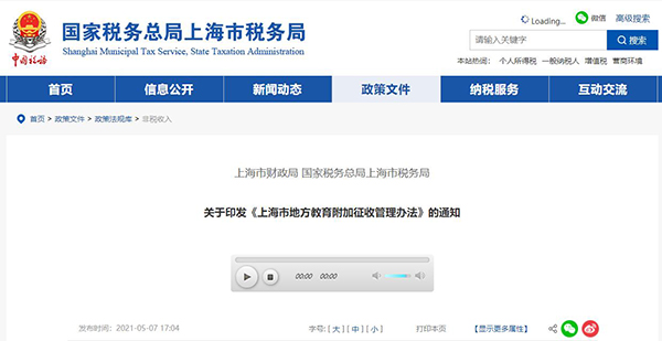 各區(qū)財政局、市財政監(jiān)督局,國家稅務(wù)總局上海市各區(qū)稅務(wù)局、各稅務(wù)分局、各稽查局: 根據(jù)《上海市人民政府關(guān)于本市繼續(xù)征收地方教育附加的通知》(滬府規(guī)〔2020〕35號)規(guī)定,為加強和規(guī)范地方教育附加的征收管理,我們制定了《上海市地方教育附加征收管理辦法》,現(xiàn)印發(fā)給你們,請按照執(zhí)行。 上海市財政局 國家稅務(wù)總局上海市稅務(wù)局 2021年4月28日 上海市地方教育附加征收管理辦法 第一條 為貫徹落實《中華人民共和國教育法》、《財政部關(guān)于同意上海市開征地方教育附加的復函》(財綜函〔2010〕78號)以及《上海市人民政府關(guān)于本市繼續(xù)征收地方教育附加的通知》(滬府規(guī)〔2020〕35號)有關(guān)精神,制定本辦法。 第二條 凡在本市行政區(qū)域內(nèi)繳納增值稅、消費稅的單位和個人(包括外商投資企業(yè)、外國企業(yè)及外籍個人),除按國家規(guī)定繳納教育費附加外,應(yīng)當按本辦法規(guī)定繳納地方教育附加。 第三條 地方教育附加以單位和個人實際繳納的增值稅、消費稅稅額為計征依據(jù),征收率為2%。地方教育附加的減免優(yōu)惠政策,按國家有關(guān)文件規(guī)定執(zhí)行。 第四條 地方教育附加由本市稅務(wù)部門負責征收,征收時應(yīng)使用稅務(wù)部門統(tǒng)一印制的稅收票證,并按國家和本市非稅收入收繳管理有關(guān)規(guī)定將收入及時、足額繳入市級國庫。 第五條 地方教育附加屬于政府性基金項目,納入財政預(yù)算,實行“收支兩條線”管理。 第六條 納稅人應(yīng)當在繳納增值稅、消費稅時一并繳納地方教育附加。單位繳納的地方教育附加,按照國家統(tǒng)一規(guī)定的會計制度處理。 第七條 各級財政、稅務(wù)、人力資源社會保障、教育、審計等部門要加強對地方教育附加的征收、解繳、使用的監(jiān)督管理和檢查。 第八條 凡未經(jīng)批準,擅自多征、減征、緩征、停征,或者侵占、截留、挪用地方教育附加的,要依照《財政違法行為處罰處分條例》(國務(wù)院令第427號)和《違反行政事業(yè)性收費和罰沒收入收支兩條線管理規(guī)定行政處分暫行規(guī)定》(國務(wù)院令第281號)追究責任人的行政責任;構(gòu)成犯罪的,依法追究刑事責任。 第九條 本辦法自2021年5月1日起施行,2021年1月1日至2021年4月30日期間征收管理的相關(guān)事宜參照本辦法執(zhí)行。 第十條 本辦法由市財政局、市稅務(wù)局按照各自職責負責解釋。 |