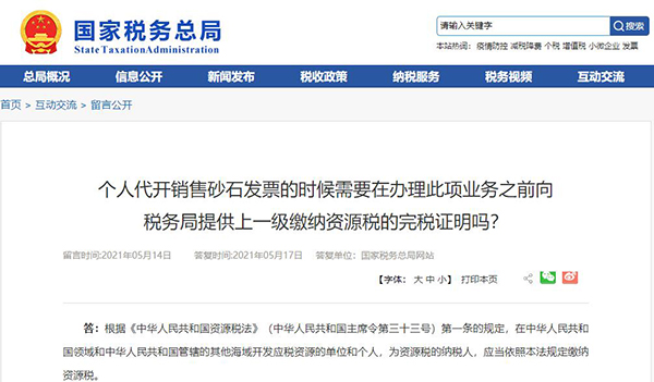 個人代開銷售砂石發(fā)票的時候需要在辦理此項業(yè)務之前向稅務局提供上一級繳納資源稅的完稅證明嗎? 答:根據《中華人民共和國資源稅法》(中華人民共和國主席令第三十三號)第一條的規(guī)定,在中華人民共和國領域和中華人民共和國管轄的其他海域開發(fā)應稅資源的單位和個人,為資源稅的納稅人,應當依照本法規(guī)定繳納資源稅。 根據《國家稅務總局關于公布取消一批稅務證明事項以及廢止和修改部分規(guī)章規(guī)范性文件的決定》(國家稅務總局令第48號)廢止了《中華人民共和國資源稅代扣代繳管理辦法》(國稅發(fā)〔1998〕49號文件印發(fā),國家稅務總局令第44號修改),該文件的解讀闡述:取消“資源稅管理證明”后,實行納稅人自主申報,不再采用代扣代繳的征管方式。 根據《全國稅務機關納稅服務規(guī)范》規(guī)定,代開增值稅普通發(fā)票辦理材料如下: 《代開增值稅發(fā)票繳納稅款申報單》、若屬于自然人,提供身份證件原件及復印件(原件查驗后退回),若屬于已辦理稅務登記的納稅人,提供加載統(tǒng)一社會信用代碼的營業(yè)執(zhí)照(或稅務登記證、組織機構代碼證等)原件(查驗后退回)、經辦人身份證件原件及復印件(原件查驗后退回)。 上述回復僅供參考。 |