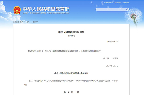 中華人民共和國國務(wù)院令 第741號(hào) 國令第741號(hào) 現(xiàn)公布修訂后的《中華人民共和國民辦教育促進(jìn)法實(shí)施條例》,自2021年9月1日起施行。 總 理李克強(qiáng) 2021年4月7日 中華人民共和國民辦教育促進(jìn)法實(shí)施條例 (2004年3月5日中華人民共和國國務(wù)院令第399號(hào)公布 2021年4月7日中華人民共和國國務(wù)院令第741號(hào)修訂) 第一章 總則 第一條 根據(jù)《中華人民共和國民辦教育促進(jìn)法》(以下簡稱民辦教育促進(jìn)法),制定本條例。 第二條 國家機(jī)構(gòu)以外的社會(huì)組織或者個(gè)人可以利用非國家財(cái)政性經(jīng)費(fèi)舉辦各級(jí)各類民辦學(xué)校;但是,不得舉辦實(shí)施軍事、警察、政治等特殊性質(zhì)教育的民辦學(xué)校。 民辦教育促進(jìn)法和本條例所稱國家財(cái)政性經(jīng)費(fèi),是指財(cái)政撥款、依法取得并應(yīng)當(dāng)上繳國庫或者財(cái)政專戶的財(cái)政性資金。 第三條 各級(jí)人民政府應(yīng)當(dāng)依法支持和規(guī)范社會(huì)力量舉辦民辦教育,保障民辦學(xué)校依法辦學(xué)、自主管理,鼓勵(lì)、引導(dǎo)民辦學(xué)校提高質(zhì)量、辦出特色,滿足多樣化教育需求。 對于舉辦民辦學(xué)校表現(xiàn)突出或者為發(fā)展民辦教育事業(yè)做出突出貢獻(xiàn)的社會(huì)組織或者個(gè)人,按照國家有關(guān)規(guī)定給予獎(jiǎng)勵(lì)和表彰。 第四條 民辦學(xué)校應(yīng)當(dāng)堅(jiān)持中國共產(chǎn)黨的領(lǐng)導(dǎo),堅(jiān)持社會(huì)主義辦學(xué)方向,堅(jiān)持教育公益性,對受教育者加強(qiáng)社會(huì)主義核心價(jià)值觀教育,落實(shí)立德樹人根本任務(wù)。 民辦學(xué)校中的中國共產(chǎn)黨基層組織貫徹黨的方針政策,依照法律、行政法規(guī)和國家有關(guān)規(guī)定參與學(xué)校重大決策并實(shí)施監(jiān)督。 第二章 民辦學(xué)校的設(shè)立 第五條 國家機(jī)構(gòu)以外的社會(huì)組織或者個(gè)人可以單獨(dú)或者聯(lián)合舉辦民辦學(xué)校。聯(lián)合舉辦民辦學(xué)校的,應(yīng)當(dāng)簽訂聯(lián)合辦學(xué)協(xié)議,明確合作方式、各方權(quán)利義務(wù)和爭議解決方式等。 國家鼓勵(lì)以捐資、設(shè)立基金會(huì)等方式依法舉辦民辦學(xué)校。以捐資等方式舉辦民辦學(xué)校,無舉辦者的,其辦學(xué)過程中的舉辦者權(quán)責(zé)由發(fā)起人履行。 在中國境內(nèi)設(shè)立的外商投資企業(yè)以及外方為實(shí)際控制人的社會(huì)組織不得舉辦、參與舉辦或者實(shí)際控制實(shí)施義務(wù)教育的民辦學(xué)校;舉辦其他類型民辦學(xué)校的,應(yīng)當(dāng)符合國家有關(guān)外商投資的規(guī)定。 第六條 舉辦民辦學(xué)校的社會(huì)組織或者個(gè)人應(yīng)當(dāng)有良好的信用狀況。舉辦民辦學(xué)?梢杂秘泿懦鲑Y,也可以用實(shí)物、建設(shè)用地使用權(quán)、知識(shí)產(chǎn)權(quán)等可以用貨幣估價(jià)并可以依法轉(zhuǎn)讓的非貨幣財(cái)產(chǎn)作價(jià)出資;但是,法律、行政法規(guī)規(guī)定不得作為出資的財(cái)產(chǎn)除外。 第七條 實(shí)施義務(wù)教育的公辦學(xué)校不得舉辦或者參與舉辦民辦學(xué)校,也不得轉(zhuǎn)為民辦學(xué)校。其他公辦學(xué)校不得舉辦或者參與舉辦營利性民辦學(xué)校。但是,實(shí)施職業(yè)教育的公辦學(xué)校可以吸引企業(yè)的資本、技術(shù)、管理等要素,舉辦或者參與舉辦實(shí)施職業(yè)教育的營利性民辦學(xué)校。 公辦學(xué)校舉辦或者參與舉辦民辦學(xué)校,不得利用國家財(cái)政性經(jīng)費(fèi),不得影響公辦學(xué)校教學(xué)活動(dòng),不得僅以品牌輸出方式參與辦學(xué),并應(yīng)當(dāng)經(jīng)其主管部門批準(zhǔn)。公辦學(xué)校舉辦或者參與舉辦非營利性民辦學(xué)校,不得以管理費(fèi)等方式取得或者變相取得辦學(xué)收益。 公辦學(xué)校舉辦或者參與舉辦的民辦學(xué)校應(yīng)當(dāng)具有獨(dú)立的法人資格,具有與公辦學(xué)校相分離的校園、基本教育教學(xué)設(shè)施和獨(dú)立的專任教師隊(duì)伍,按照國家統(tǒng)一的會(huì)計(jì)制度獨(dú)立進(jìn)行會(huì)計(jì)核算,獨(dú)立招生,獨(dú)立頒發(fā)學(xué)業(yè)證書。 舉辦或者參與舉辦民辦學(xué)校的公辦學(xué)校依法享有舉辦者權(quán)益,依法履行國有資產(chǎn)管理義務(wù)。 第八條 地方人民政府不得利用國有企業(yè)、公辦教育資源舉辦或者參與舉辦實(shí)施義務(wù)教育的民辦學(xué)校。 以國有資產(chǎn)參與舉辦民辦學(xué)校的,應(yīng)當(dāng)根據(jù)國家有關(guān)國有資產(chǎn)監(jiān)督管理的規(guī)定,聘請具有評(píng)估資格的中介機(jī)構(gòu)依法進(jìn)行評(píng)估,根據(jù)評(píng)估結(jié)果合理確定出資額,并報(bào)對該國有資產(chǎn)負(fù)有監(jiān)管職責(zé)的機(jī)構(gòu)備案。 第九條 國家鼓勵(lì)企業(yè)以獨(dú)資、合資、合作等方式依法舉辦或者參與舉辦實(shí)施職業(yè)教育的民辦學(xué)校。 第十條 舉辦民辦學(xué)校,應(yīng)當(dāng)按時(shí)、足額履行出資義務(wù)。民辦學(xué)校存續(xù)期間,舉辦者不得抽逃出資,不得挪用辦學(xué)經(jīng)費(fèi)。 舉辦者可以依法募集資金舉辦營利性民辦學(xué)校,所