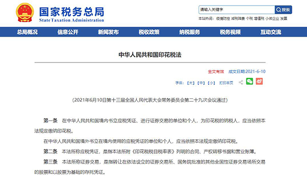 中華人民共和國(guó)印花稅法 第一條 在中華人民共和國(guó)境內(nèi)書(shū)立應(yīng)稅憑證、進(jìn)行證券交易的單位和個(gè)人,為印花稅的納稅人,應(yīng)當(dāng)依照本法規(guī)定繳納印花稅。 在中華人民共和國(guó)境外書(shū)立在境內(nèi)使用的應(yīng)稅憑證的單位和個(gè)人,應(yīng)當(dāng)依照本法規(guī)定繳納印花稅。 第二條 本法所稱應(yīng)稅憑證,是指本法所附《印花稅稅目稅率表》列明的合同、產(chǎn)權(quán)轉(zhuǎn)移書(shū)據(jù)和營(yíng)業(yè)賬簿。 第三條 本法所稱證券交易,是指轉(zhuǎn)讓在依法設(shè)立的證券交易所、國(guó)務(wù)院批準(zhǔn)的其他全國(guó)性證券交易場(chǎng)所交易的股票和以股票為基礎(chǔ)的存托憑證。 證券交易印花稅對(duì)證券交易的出讓方征收,不對(duì)受讓方征收。 第四條 印花稅的稅目、稅率,依照本法所附《印花稅稅目稅率表》執(zhí)行。 第五條 印花稅的計(jì)稅依據(jù)如下: (一)應(yīng)稅合同的計(jì)稅依據(jù),為合同所列的金額,不包括列明的增值稅稅款; (二)應(yīng)稅產(chǎn)權(quán)轉(zhuǎn)移書(shū)據(jù)的計(jì)稅依據(jù),為產(chǎn)權(quán)轉(zhuǎn)移書(shū)據(jù)所列的金額,不包括列明的增值稅稅款; (三)應(yīng)稅營(yíng)業(yè)賬簿的計(jì)稅依據(jù),為賬簿記載的實(shí)收資本(股本)、資本公積合計(jì)金額; (四)證券交易的計(jì)稅依據(jù),為成交金額。 第六條 應(yīng)稅合同、產(chǎn)權(quán)轉(zhuǎn)移書(shū)據(jù)未列明金額的,印花稅的計(jì)稅依據(jù)按照實(shí)際結(jié)算的金額確定。 計(jì)稅依據(jù)按照前款規(guī)定仍不能確定的,按照書(shū)立合同、產(chǎn)權(quán)轉(zhuǎn)移書(shū)據(jù)時(shí)的市場(chǎng)價(jià)格確定;依法應(yīng)當(dāng)執(zhí)行政府定價(jià)或者政府指導(dǎo)價(jià)的,按照國(guó)家有關(guān)規(guī)定確定。 第七條 證券交易無(wú)轉(zhuǎn)讓價(jià)格的,按照辦理過(guò)戶登記手續(xù)時(shí)該證券前一個(gè)交易日收盤(pán)價(jià)計(jì)算確定計(jì)稅依據(jù);無(wú)收盤(pán)價(jià)的,按照證券面值計(jì)算確定計(jì)稅依據(jù)。 第八條 印花稅的應(yīng)納稅額按照計(jì)稅依據(jù)乘以適用稅率計(jì)算。 第九條 同一應(yīng)稅憑證載有兩個(gè)以上稅目事項(xiàng)并分別列明金額的,按照各自適用的稅目稅率分別計(jì)算應(yīng)納稅額;未分別列明金額的,從高適用稅率。 第十條 同一應(yīng)稅憑證由兩方以上當(dāng)事人書(shū)立的,按照各自涉及的金額分別計(jì)算應(yīng)納稅額。 第十一條 已繳納印花稅的營(yíng)業(yè)賬簿,以后年度記載的實(shí)收資本(股本)、資本公積合計(jì)金額比已繳納印花稅的實(shí)收資本(股本)、資本公積合計(jì)金額增加的,按照增加部分計(jì)算應(yīng)納稅額。 第十二條 下列憑證免征印花稅: (一)應(yīng)稅憑證的副本或者抄本; (二)依照法律規(guī)定應(yīng)當(dāng)予以免稅的外國(guó)駐華使館、領(lǐng)事館和國(guó)際組織駐華代表機(jī)構(gòu)為獲得館舍書(shū)立的應(yīng)稅憑證; (三)中國(guó)人民解放軍、中國(guó)人民武裝警察部隊(duì)書(shū)立的應(yīng)稅憑證; (四)農(nóng)民、家庭農(nóng)場(chǎng)、農(nóng)民專業(yè)合作社、農(nóng)村集體經(jīng)濟(jì)組織、村民委員會(huì)購(gòu)買農(nóng)業(yè)生產(chǎn)資料或者銷售農(nóng)產(chǎn)品書(shū)立的買賣合同和農(nóng)業(yè)保險(xiǎn)合同; (五)無(wú)息或者貼息借款合同、國(guó)際金融組織向中國(guó)提供優(yōu)惠貸款書(shū)立的借款合同; (六)財(cái)產(chǎn)所有權(quán)人將財(cái)產(chǎn)贈(zèng)與政府、學(xué)校、社會(huì)福利機(jī)構(gòu)、慈善組織書(shū)立的產(chǎn)權(quán)轉(zhuǎn)移書(shū)據(jù); (七)非營(yíng)利性醫(yī)療衛(wèi)生機(jī)構(gòu)采購(gòu)藥品或者衛(wèi)生材料書(shū)立的買賣合同; (八)個(gè)人與電子商務(wù)經(jīng)營(yíng)者訂立的電子訂單。 根據(jù)國(guó)民經(jīng)濟(jì)和社會(huì)發(fā)展的需要,國(guó)務(wù)院對(duì)居民住房需求保障、企業(yè)改制重組、破產(chǎn)、支持小型微型企業(yè)發(fā)展等情形可以規(guī)定減征或者免征印花稅,報(bào)全國(guó)人民代表大會(huì)常務(wù)委員會(huì)備案。 第十三條 納稅人為單位的,應(yīng)當(dāng)向其機(jī)構(gòu)所在地的主管稅務(wù)機(jī)關(guān)申報(bào)繳納印花稅;納稅人為個(gè)人的,應(yīng)當(dāng)向應(yīng)稅憑證書(shū)立地或者納稅人居住地的主管稅務(wù)機(jī)關(guān)申報(bào)繳納印花稅。 不動(dòng)產(chǎn)產(chǎn)權(quán)發(fā)生轉(zhuǎn)移的,納稅人應(yīng)當(dāng)向不動(dòng)產(chǎn)所在地的主管稅務(wù)機(jī)關(guān)申報(bào)繳納印花稅。 第十四條 納稅人為境外單位或者個(gè)人,在境內(nèi)有代理人的,以其境內(nèi)代理人為扣繳義務(wù)人;在境內(nèi)沒(méi)有代理人的,由納稅人自行申報(bào)繳納印花稅,具體辦法由國(guó)務(wù)院稅務(wù)主管部門(mén)規(guī)定。 證券登記結(jié)算機(jī)構(gòu)為證券交易印花稅的扣繳義務(wù)人,應(yīng)當(dāng)向其機(jī)構(gòu)所在地的主管稅務(wù)機(jī)關(guān)申報(bào)解繳稅款以及銀行結(jié)算的利息。 第十五條 印花稅的納稅義務(wù)發(fā)生時(shí)間為納稅