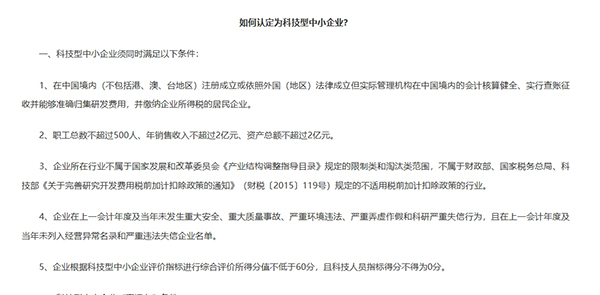 科技型中小企業(yè)評(píng)價(jià)辦法 第一章總則 第一條為貫徹落實(shí)《國(guó)家創(chuàng)新驅(qū)動(dòng)發(fā)展戰(zhàn)略綱要》,推動(dòng)大眾創(chuàng)業(yè)萬(wàn)眾創(chuàng)新,加速科技成果產(chǎn)業(yè)化,加大對(duì)科技型中小企業(yè)的精準(zhǔn)支持力度,壯大科技型中小企業(yè)群體,培育新的經(jīng)濟(jì)增長(zhǎng)點(diǎn),根據(jù)《深化科技體制改革實(shí)施方案》要求,制定本辦法。 第二條本辦法所稱的科技型中小企業(yè)是指依托一定數(shù)量的科技人員從事科學(xué)技術(shù)研究開(kāi)發(fā)活動(dòng),取得自主知識(shí)產(chǎn)權(quán)并將其轉(zhuǎn)化為高新技術(shù)產(chǎn)品或服務(wù),從而實(shí)現(xiàn)可持續(xù)發(fā)展的中小企業(yè)。 第三條科技型中小企業(yè)評(píng)價(jià)工作采取企業(yè)自主評(píng)價(jià)、省級(jí)科技管理部門組織實(shí)施、科技部服務(wù)監(jiān)督的工作模式,堅(jiān)持服務(wù)引領(lǐng)、放管結(jié)合、公開(kāi)透明的原則。 第四條科技部負(fù)責(zé)建設(shè)“全國(guó)科技型中小企業(yè)信息服務(wù)平臺(tái)”(以下簡(jiǎn)稱“服務(wù)平臺(tái)”)和“全國(guó)科技型中小企業(yè)信息庫(kù)”(以下簡(jiǎn)稱“信息庫(kù)”)?萍疾炕鹁娓呒夹g(shù)產(chǎn)業(yè)開(kāi)發(fā)中心負(fù)責(zé)服務(wù)平臺(tái)和信息庫(kù)建設(shè)與運(yùn)行的日常工作。 企業(yè)可根據(jù)本辦法進(jìn)行自主評(píng)價(jià),并按照自愿原則到服務(wù)平臺(tái)填報(bào)企業(yè)信息,經(jīng)公示無(wú)異議的,納入信息庫(kù)。 第五條各有關(guān)部門和各級(jí)人民政府應(yīng)當(dāng)對(duì)納入信息庫(kù)的科技型中小企業(yè)提供精準(zhǔn)支持和精準(zhǔn)服務(wù),制定的支持企業(yè)技術(shù)創(chuàng)新的政策措施應(yīng)優(yōu)先支持納入信息庫(kù)的企業(yè)。 第二章評(píng)價(jià)指標(biāo) 第六條科技型中小企業(yè)須同時(shí)滿足以下條件: (一)在中國(guó)境內(nèi)(不包括港、澳、臺(tái)地區(qū))注冊(cè)的居民企業(yè)。 (二)職工總數(shù)不超過(guò)500人、年銷售收入不超過(guò)2億元、資產(chǎn)總額不超過(guò)2億元。 (三)企業(yè)提供的產(chǎn)品和服務(wù)不屬于國(guó)家規(guī)定的禁止、限制和淘汰類。 (四)企業(yè)在填報(bào)上一年及當(dāng)年內(nèi)未發(fā)生重大安全、重大質(zhì)量事故和嚴(yán)重環(huán)境違法、科研嚴(yán)重失信行為,且企業(yè)未列入經(jīng)營(yíng)異常名錄和嚴(yán)重違法失信企業(yè)名單。 (五)企業(yè)根據(jù)科技型中小企業(yè)評(píng)價(jià)指標(biāo)進(jìn)行綜合評(píng)價(jià)所得分值不低于60分,且科技人員指標(biāo)得分不得為0分。 第七條科技型中小企業(yè)評(píng)價(jià)指標(biāo)具體包括科技人員、研發(fā)投入、科技成果三類,滿分100分。 1.科技人員指標(biāo)(滿分20分)。按科技人員數(shù)占企業(yè)職工總數(shù)的比例分檔評(píng)價(jià)。 A.30%(含)以上(20分) B.25%(含)-30%(16分) C.20%(含)-25%(12分) D.15%(含)-20%(8分) E.10%(含)-15%(4分) F.10%以下(0分) 2.研發(fā)投入指標(biāo)(滿分50分)。企業(yè)從(1)、(2)兩項(xiàng)指標(biāo)中選擇一個(gè)指標(biāo)進(jìn)行評(píng)分。 (1)按企業(yè)研發(fā)費(fèi)用總額占銷售收入總額的比例分檔評(píng)價(jià)。 A.6%(含)以上(50分) B.5%(含)-6%(40分) C.4%(含)-5%(30分) D.3%(含)-4%(20分) E.2%(含)-3%(10分) F.2%以下(0分) (2)按企業(yè)研發(fā)費(fèi)用總額占成本費(fèi)用支出總額的比例分檔評(píng)價(jià)。 A.30%(含)以上(50分) B.25%(含)-30%(40分) C.20%(含)-25%(30分) D.15%(含)-20%(20分) E.10%(含)-15%(10分) F.10%以下(0分) 3.科技成果指標(biāo)(滿分30分)。按企業(yè)擁有的在有效期內(nèi)的與主要產(chǎn)品(或服務(wù))相關(guān)的知識(shí)產(chǎn)權(quán)類別和數(shù)量(知識(shí)產(chǎn)權(quán)應(yīng)沒(méi)有爭(zhēng)議或糾紛)分檔評(píng)價(jià)。 A.1項(xiàng)及以上Ⅰ類知識(shí)產(chǎn)權(quán)(30分) B.4項(xiàng)及以上Ⅱ類知識(shí)產(chǎn)權(quán)(24分) C.3項(xiàng)Ⅱ類知識(shí)產(chǎn)權(quán)(18分) D.2項(xiàng)Ⅱ類知識(shí)產(chǎn)權(quán)(12分) E.1項(xiàng)Ⅱ類知識(shí)產(chǎn)權(quán)(6分) F.沒(méi)有知識(shí)產(chǎn)權(quán)(0分) 第八條符合第六條第(一)~(四)項(xiàng)條件的企業(yè),若同時(shí)符合下列條件中的一項(xiàng),則可直接確認(rèn)符合科技型中小企業(yè)條件: (一)企業(yè)擁有有效期內(nèi)高新技術(shù)企業(yè)資格證書(shū); (二)企業(yè)近五年內(nèi)獲得過(guò)國(guó)家級(jí)科技獎(jiǎng)勵(lì),并在獲獎(jiǎng)單位中排在前三名; (三)企業(yè)擁有經(jīng)認(rèn)定的省部級(jí)以上研發(fā)機(jī)構(gòu); (四)企業(yè)近五年內(nèi)主導(dǎo)制定過(guò)國(guó)際標(biāo)準(zhǔn)、國(guó)家標(biāo)準(zhǔn)或行業(yè)標(biāo)準(zhǔn)。 第九條科技型中小企業(yè)評(píng)價(jià)指標(biāo)的說(shuō)明: (一)企業(yè)科技人員是指企業(yè)直接從事研發(fā)和相關(guān)技術(shù)創(chuàng)新活動(dòng),以及專門從事上述活動(dòng)管理和提供直接服務(wù)的人員,包括在職、兼職和臨時(shí)聘用人員,兼職、臨時(shí)聘用人員全年須在企業(yè)累計(jì)工作6個(gè)月以上。 (二)企業(yè)職工總數(shù)包括企