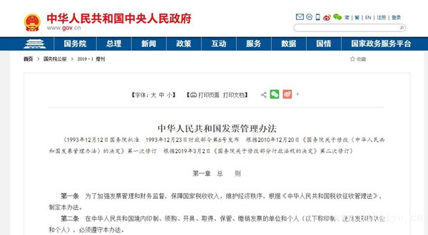 中華人民共和國發(fā)票管理辦法 第一章 總則 第一條 為了加強發(fā)票管理和財務(wù)監(jiān)督,保障國家稅收收入,維護經(jīng)濟秩序,根據(jù)《中華人民共和國稅收征收管理法》,制定本辦法。 第二條 在中華人民共和國境內(nèi)印制、領(lǐng)購、開具、取得、保管、繳銷發(fā)票的單位和個人(以下稱印制、使用發(fā)票的單位和個人),必須遵守本辦法。 第三條 本辦法所稱發(fā)票,是指在購銷商品、提供或者接受服務(wù)以及從事其他經(jīng)營活動中,開具、收取的收付款憑證。 第四條 國務(wù)院稅務(wù)主管部門統(tǒng)一負責全國的發(fā)票管理工作。省、自治區(qū)、直轄市稅務(wù)機關(guān)依據(jù)職責做好本行政區(qū)域內(nèi)的發(fā)票管理工作。 財政、審計、市場監(jiān)督管理、公安等有關(guān)部門在各自的職責范圍內(nèi),配合稅務(wù)機關(guān)做好發(fā)票管理工作。 第五條 發(fā)票的種類、聯(lián)次、內(nèi)容以及使用范圍由國務(wù)院稅務(wù)主管部門規(guī)定。 第六條 對違反發(fā)票管理法規(guī)的行為,任何單位和個人可以舉報。稅務(wù)機關(guān)應(yīng)當為檢舉人保密,并酌情給予獎勵。 第二章 發(fā)票的印制 第七條 增值稅專用發(fā)票由國務(wù)院稅務(wù)主管部門確定的企業(yè)印制;其他發(fā)票,按照國務(wù)院稅務(wù)主管部門的規(guī)定,由省、自治區(qū)、直轄市稅務(wù)機關(guān)確定的企業(yè)印制。禁止私自印制、偽造、變造發(fā)票。 第八條 印制發(fā)票的企業(yè)應(yīng)當具備下列條件: (一)取得印刷經(jīng)營許可證和營業(yè)執(zhí)照; (二)設(shè)備、技術(shù)水平能夠滿足印制發(fā)票的需要; (三)有健全的財務(wù)制度和嚴格的質(zhì)量監(jiān)督、安全管理、保密制度。 稅務(wù)機關(guān)應(yīng)當以招標方式確定印制發(fā)票的企業(yè),并發(fā)給發(fā)票準印證。 第九條 印制發(fā)票應(yīng)當使用國務(wù)院稅務(wù)主管部門確定的全國統(tǒng)一的發(fā)票防偽專用品。禁止非法制造發(fā)票防偽專用品。 第十條 發(fā)票應(yīng)當套印全國統(tǒng)一發(fā)票監(jiān)制章。全國統(tǒng)一發(fā)票監(jiān)制章的式樣和發(fā)票版面印刷的要求,由國務(wù)院稅務(wù)主管部門規(guī)定。發(fā)票監(jiān)制章由省、自治區(qū)、直轄市稅務(wù)機關(guān)制作。禁止偽造發(fā)票監(jiān)制章。 發(fā)票實行不定期換版制度。 第十一條 印制發(fā)票的企業(yè)按照稅務(wù)機關(guān)的統(tǒng)一規(guī)定,建立發(fā)票印制管理制度和保管措施。 發(fā)票監(jiān)制章和發(fā)票防偽專用品的使用和管理實行專人負責制度。 第十二條 印制發(fā)票的企業(yè)必須按照稅務(wù)機關(guān)批準的式樣和數(shù)量印制發(fā)票。 第十三條 發(fā)票應(yīng)當使用中文印制。民族自治地方的發(fā)票,可以加印當?shù)匾环N通用的民族文字。有實際需要的,也可以同時使用中外兩種文字印制。 第十四條 各省、自治區(qū)、直轄市內(nèi)的單位和個人使用的發(fā)票,除增值稅專用發(fā)票外,應(yīng)當在本省、自治區(qū)、直轄市內(nèi)印制;確有必要到外省、自治區(qū)、直轄市印制的,應(yīng)當由省、自治區(qū)、直轄市稅務(wù)機關(guān)商印制地省、自治區(qū)、直轄市稅務(wù)機關(guān)同意,由印制地省、自治區(qū)、直轄市稅務(wù)機關(guān)確定的企業(yè)印制。 禁止在境外印制發(fā)票。 第三章 發(fā)票的領(lǐng)購 第十五條 需要領(lǐng)購發(fā)票的單位和個人,應(yīng)當持稅務(wù)登記證件、經(jīng)辦人身份證明、按照國務(wù)院稅務(wù)主管部門規(guī)定式樣制作的發(fā)票專用章的印模,向主管稅務(wù)機關(guān)辦理發(fā)票領(lǐng)購手續(xù)。主管稅務(wù)機關(guān)根據(jù)領(lǐng)購單位和個人的經(jīng)營范圍和規(guī)模,確認領(lǐng)購發(fā)票的種類、數(shù)量以及領(lǐng)購方式,在5個工作日內(nèi)發(fā)給發(fā)票領(lǐng)購簿。 單位和個人領(lǐng)購發(fā)票時,應(yīng)當按照稅務(wù)機關(guān)的規(guī)定報告發(fā)票使用情況,稅務(wù)機關(guān)應(yīng)當按照規(guī)定進行查驗。 第十六條 需要臨時使用發(fā)票的單位和個人,可以憑購銷商品、提供或者接受服務(wù)以及從事其他經(jīng)營活動的書面證明、經(jīng)辦人身份證明,直接向經(jīng)營地稅務(wù)機關(guān)申請代開發(fā)票。依照稅收法律、行政法規(guī)規(guī)定應(yīng)當繳納稅款的,稅務(wù)機關(guān)應(yīng)當先征收稅款,再開具發(fā)票。稅務(wù)機關(guān)根據(jù)發(fā)票管理的需要,可以按照國務(wù)院稅務(wù)主管部門的規(guī)定委托其他單位代開發(fā)票。 禁止非法代開發(fā)票。 第十七條 臨時到本省、自治區(qū)、直轄市以外從事經(jīng)營活動的單位或者個人,應(yīng)當憑所在地稅務(wù)機關(guān)的證明,向經(jīng)營地稅務(wù)機關(guān)領(lǐng)購經(jīng)營地的發(fā)票。 臨時在本省、自治區(qū)、直轄市以內(nèi)跨市、縣從事經(jīng)營活動領(lǐng)購發(fā)票的辦法,由省、自治區(qū)、直轄市稅務(wù)機關(guān)規(guī)定。 第十八條 稅務(wù)機關(guān)對外省、自治區(qū)、直轄市來本轄區(qū)從事臨時經(jīng)營活動的單位和個人領(lǐng)購發(fā)票的,可以要求其提供保證人