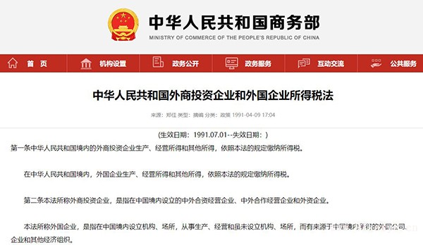 中華人民共和國外商投資企業(yè)和外國企業(yè)所得稅法 第一條中華人民共和國境內的外商投資企業(yè)生產、經營所得和其他所得,依照本法的規(guī)定繳納所得稅。 在中華人民共和國境內,外國企業(yè)生產、經營所得和其他所得,依照本法的規(guī)定繳納所得稅。 第二條本法所稱外商投資企業(yè),是指在中國境內設立的中外合資經營企業(yè)、中外合作經營企業(yè)和外資企業(yè)。 本法所稱外國企業(yè),是指在中國境內設立機構、場所,從事生產、經營和雖未設立機構、場所,而有來源于中國境內所得的外國公司、企業(yè)和其他經濟組織。 第三條外商投資企業(yè)的總機構設在中國境內,就來源于中國境內、境外的所得繳納所得稅。外國企業(yè)就來源于中國境內的所得繳納所得稅。 第四條外商投資企業(yè)和外國企業(yè)在中國境內設立的從事生產、經營的機構、場所每一納稅年度的收入總額,減除成本、費用以及損失后的余額,為應納稅的所得額。 第五條外商投資企業(yè)的企業(yè)所得稅和外國企業(yè)就其在中國境內設立的從事生產、經營的機構、場所的所得應納的企業(yè)所得稅,按應納稅的所得額計算,稅率為百分之三十;地方所得稅,按應納稅的所得額計算,稅率為百分之三。 第六條國家按照產業(yè)政策,引導外商投資方向,鼓勵舉辦采用先進技術、設備、產品全部或者大部分出口的外商投資企業(yè)。 第七條設在經濟特區(qū)的外商投資企業(yè)、在經濟特區(qū)設立機構、場所從事生產、經營的外國企業(yè)和設在經濟技術開發(fā)區(qū)的生產性外商投資企業(yè),減按百分之十五的稅率征收企業(yè)所得稅。 設在沿海經濟開放區(qū)和經濟特區(qū)、經濟技術開發(fā)區(qū)所在城市的老市區(qū)的生產性外商投資企業(yè),減按百分之二十四的稅率征收企業(yè)所得稅。 設在沿海經濟開放區(qū)和經濟特區(qū)、經濟技術開發(fā)區(qū)所在城市的老市區(qū)或者設在國務院規(guī)定的其他地區(qū)的外商投資企業(yè),屬于能源、交通、港口、碼頭或者國家鼓勵的其他項目的,可以減按百分之十五的稅率征收企業(yè)所得稅,具體辦法由國務院規(guī)定。 第八條對生產性外商投資企業(yè),經營期在十年以上的,從開始獲利的年度起,第一年和第二年免征企業(yè)所得稅,第三年至第五年減半征收企業(yè)所得稅,但是屬于石油、天然氣、稀有金屬、貴重金屬等資源開采項目的,由國務院另行規(guī)定。外商投資企業(yè)實際經營期不滿十年的,應當補繳已免征、減征的企業(yè)所得稅稅款。 本法施行前國務院公布的規(guī)定,對能源、交通、港口、碼頭以及其他重要生產性項目給予比前款規(guī)定更長期限的免征、減征企業(yè)所得稅的優(yōu)惠待遇,或者對非生產性的重要項目給予免征、減征企業(yè)所得稅的優(yōu)惠待遇,在本法施行后繼續(xù)執(zhí)行。 從事農業(yè)、林業(yè)、牧業(yè)的外商投資企業(yè)和設在經濟不發(fā)達的邊遠地區(qū)的外商投資企業(yè),依照前兩款規(guī)定享受免稅、減稅待遇期滿后,經企業(yè)申請,國務院稅務主管部門批準,在以后的十年內可以繼續(xù)按應納稅額減征百分之十五至百分之三十的企業(yè)所得稅。 本法施行后,需要變更前三款的免征、減征企業(yè)所得稅的規(guī)定的,由國務院報全國人民代表大會常務委員會決定。 第九條對鼓勵外商投資的行業(yè)、項目,省、自治區(qū)、直轄市人民政府可以根據實際情況決定免征、減征地方所得稅。 第十條外商投資企業(yè)的外國投資者,將從企業(yè)取得的利潤直接再投資于該企業(yè),增加注冊資本,或者作為資本投資開辦其他外商投資企業(yè),經營期不少于五年的,經投資者申請,稅務機關批準,退還其再投資部分已繳納所得稅的百分之四十稅款,國務院另有優(yōu)惠規(guī)定的,依照國務院的規(guī)定辦理;再投資不滿五年撤出的,應當繳回已退的稅款。 第十一條外商投資企業(yè)和外國企業(yè)在中國境內設立的從事生產、經營的機構、場所發(fā)生年度虧損,可以用下一納稅年度的所得彌補;下一納稅年度的所得不足彌補的,可以逐年延續(xù)彌補,但最長不得超過五年。 第十二條外商投資企業(yè)來源于中國境外的所得已在境外繳納的所得稅稅款,準予在匯總納稅時,從其應納稅額中扣除,但扣除額不得超過其境外所得依照本法規(guī)定計算的應納稅額。 第十三條外商投資企業(yè)或者外國企業(yè)在中國境內設立的從事生產、經營的機構、場所與其關聯企業(yè)之間的業(yè)務往來,應當按照獨立企業(yè)之間的業(yè)務往來收取或者支付價款、費用。不按照獨立企業(yè)之間的業(yè)務往來收取或者支付價款、費用,而減少其應納稅的所得額的,稅務機關有權進行合理調整。 第十四條外商投資企業(yè)和外國企業(yè)在中國境內設立的從事生產、經營的機構、場所設立、遷移、合并、分立、終止以及變更登記主要事項,應當向工商行政管理機關辦理登記或者變更、注銷登記,并持有關證件向當地稅務機關辦理稅務登記或者變更、注銷登記。 第十五條繳納企業(yè)所得稅和地方所得稅,按年計算,分季預繳。季度終了后十五日內預繳;年度終了后五個月內匯算清繳,多退少補。 第十六條外商投資企業(yè)和外國企業(yè)在