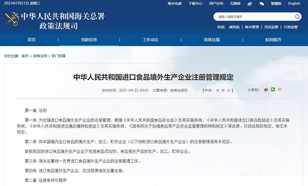 中華人民共和國進(jìn)口食品境外生產(chǎn)企業(yè)注冊管理規(guī)定 第一章 總則 第一條 為加強(qiáng)進(jìn)口食品境外生產(chǎn)企業(yè)的注冊管理,根據(jù)《中華人民共和國食品安全法》及其實(shí)施條例、《中華人民共和國進(jìn)出口商品檢驗(yàn)法》及其實(shí)施條例、《中華人民共和國進(jìn)出境動(dòng)植物檢疫法》及其實(shí)施條例、《國務(wù)院關(guān)于加強(qiáng)食品等產(chǎn)品安全監(jiān)督管理的特別規(guī)定》等法律、行政法規(guī)的規(guī)定,制定本規(guī)定。 第二條 向中國境內(nèi)出口食品的境外生產(chǎn)、加工、貯存企業(yè)(以下統(tǒng)稱進(jìn)口食品境外生產(chǎn)企業(yè))的注冊管理適用本規(guī)定。 前款規(guī)定的進(jìn)口食品境外生產(chǎn)企業(yè)不包括食品添加劑、食品相關(guān)產(chǎn)品的生產(chǎn)、加工、貯存企業(yè)。 第三條 海關(guān)總署統(tǒng)一負(fù)責(zé)進(jìn)口食品境外生產(chǎn)企業(yè)的注冊管理工作。 第四條 進(jìn)口食品境外生產(chǎn)企業(yè),應(yīng)當(dāng)獲得海關(guān)總署注冊。 第二章 注冊條件與程序 第五條 進(jìn)口食品境外生產(chǎn)企業(yè)注冊條件: (一)所在國家(地區(qū))的食品安全管理體系通過海關(guān)總署等效性評(píng)估、審查; (二)經(jīng)所在國家(地區(qū))主管當(dāng)局批準(zhǔn)設(shè)立并在其有效監(jiān)管下; (三)建立有效的食品安全衛(wèi)生管理和防護(hù)體系,在所在國家(地區(qū))合法生產(chǎn)和出口,保證向中國境內(nèi)出口的食品符合中國相關(guān)法律法規(guī)和食品安全國家標(biāo)準(zhǔn); (四)符合海關(guān)總署與所在國家(地區(qū))主管當(dāng)局商定的相關(guān)檢驗(yàn)檢疫要求。 第六條 進(jìn)口食品境外生產(chǎn)企業(yè)注冊方式包括所在國家(地區(qū))主管當(dāng)局推薦注冊和企業(yè)申請(qǐng)注冊。 海關(guān)總署根據(jù)對(duì)食品的原料來源、生產(chǎn)加工工藝、食品安全歷史數(shù)據(jù)、消費(fèi)人群、食用方式等因素的分析,并結(jié)合國際慣例確定進(jìn)口食品境外生產(chǎn)企業(yè)注冊方式和申請(qǐng)材料。 經(jīng)風(fēng)險(xiǎn)分析或者有證據(jù)表明某類食品的風(fēng)險(xiǎn)發(fā)生變化的,海關(guān)總署可以對(duì)相應(yīng)食品的境外生產(chǎn)企業(yè)注冊方式和申請(qǐng)材料進(jìn)行調(diào)整。 第七條 下列食品的境外生產(chǎn)企業(yè)由所在國家(地區(qū))主管當(dāng)局向海關(guān)總署推薦注冊:肉與肉制品、腸衣、水產(chǎn)品、乳品、燕窩與燕窩制品、蜂產(chǎn)品、蛋與蛋制品、食用油脂和油料、包餡面食、食用谷物、谷物制粉工業(yè)產(chǎn)品和麥芽、保鮮和脫水蔬菜以及干豆、調(diào)味料、堅(jiān)果與籽類、干果、未烘焙的咖啡豆與可可豆、特殊膳食食品、保健食品。 第八條 所在國家(地區(qū))主管當(dāng)局應(yīng)當(dāng)對(duì)其推薦注冊的企業(yè)進(jìn)行審核檢查,確認(rèn)符合注冊要求后,向海關(guān)總署推薦注冊并提交以下申請(qǐng)材料: (一)所在國家(地區(qū))主管當(dāng)局推薦函; (二)企業(yè)名單與企業(yè)注冊申請(qǐng)書; (三)企業(yè)身份證明文件,如所在國家(地區(qū))主管當(dāng)局頒發(fā)的營業(yè)執(zhí)照等; (四)所在國家(地區(qū))主管當(dāng)局推薦企業(yè)符合本規(guī)定要求的聲明; (五)所在國家(地區(qū))主管當(dāng)局對(duì)相關(guān)企業(yè)進(jìn)行審核檢查的審查報(bào)告。 必要時(shí),海關(guān)總署可以要求提供企業(yè)食品安全衛(wèi)生和防護(hù)體系文件,如企業(yè)廠區(qū)、車間、冷庫的平面圖,以及工藝流程圖等。 第九條 本規(guī)定第七條所列食品以外的其他食品境外生產(chǎn)企業(yè),應(yīng)當(dāng)自行或者委托代理人向海關(guān)總署提出注冊申請(qǐng)并提交以下申請(qǐng)材料: (一)企業(yè)注冊申請(qǐng)書; (二)企業(yè)身份證明文件,如所在國家(地區(qū))主管當(dāng)局頒發(fā)的營業(yè)執(zhí)照等; (三)企業(yè)承諾符合本規(guī)定要求的聲明。 第十條 企業(yè)注冊申請(qǐng)書內(nèi)容應(yīng)當(dāng)包括企業(yè)名稱、所在國家(地區(qū))、生產(chǎn)場所地址、法定代表人、聯(lián)系人、聯(lián)系方式、所在國家(地區(qū))主管當(dāng)局批準(zhǔn)的注冊編號(hào)、申請(qǐng)注冊食品種類、生產(chǎn)類型、生產(chǎn)能力等信息。 第十一條 注冊申請(qǐng)材料應(yīng)當(dāng)用中文或者英文提交,相關(guān)國家(地區(qū))與中國就注冊方式和申請(qǐng)材料另有約定的,按照雙方約定執(zhí)行。 第十二條 所在國家(地區(qū))主管當(dāng)局或進(jìn)口食品境外生產(chǎn)企業(yè)應(yīng)當(dāng)對(duì)提交材料的真實(shí)性、完整性、合法性負(fù)責(zé)。 第十三條 海關(guān)總署自行或者委托有關(guān)機(jī)構(gòu)組織評(píng)審組,通過書面檢查、視頻檢查、現(xiàn)場檢查等形式及其組合,對(duì)申請(qǐng)注冊的進(jìn)口食品境外生產(chǎn)企業(yè)實(shí)施評(píng)估審查。評(píng)審組由2名以上評(píng)估審查人員組成。 進(jìn)口食品境外生產(chǎn)企業(yè)和所在國家(地區(qū))主管當(dāng)局應(yīng)當(dāng)協(xié)助開展上述評(píng)估審查工作。 第十四條 海關(guān)總署根據(jù)