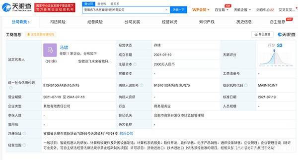 7月22日消息,據(jù)天眼查App顯示,7月19日,安徽訊飛未來智能科技有限公司成立,法定代表人為馬嘯,注冊資本2000萬人民幣,