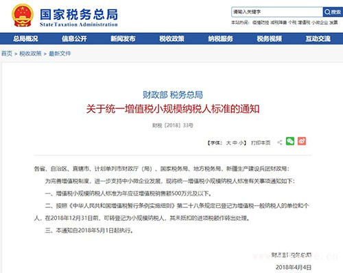 各省、自治區(qū)、直轄市、計劃單列市財政廳(局)、國家稅務(wù)局、地方稅務(wù)局,新疆生產(chǎn)建設(shè)兵團財政局: 為完善增值稅制度,進一步支持中小微企業(yè)發(fā)展,現(xiàn)將統(tǒng)一增值稅小規(guī)模納稅人標(biāo)準(zhǔn)有關(guān)事項通知如下: 一、增值稅小規(guī)模納稅人標(biāo)準(zhǔn)為年應(yīng)征增值稅銷售額500萬元及以下。 二、按照《中華人民共和國增值稅暫行條例實施細(xì)則》第二十八條規(guī)定已登記為增值稅一般納稅人的單位和個人,在2018年12月31日前,可轉(zhuǎn)登記為小規(guī)模納稅人,其未抵扣的進項稅額作轉(zhuǎn)出處理。 三、本通知自2018年5月1日起執(zhí)行。 財政部 稅務(wù)總局 2018年4月4日 |