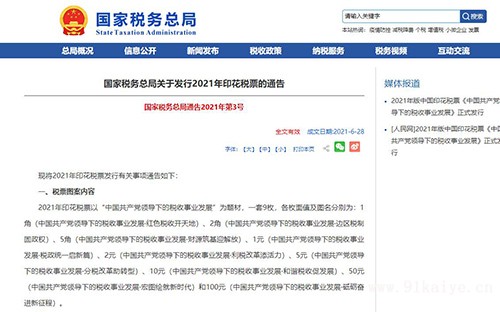 現(xiàn)將2021年印花稅票發(fā)行有關(guān)事項(xiàng)通告如下: 一、稅票圖案內(nèi)容 2021年印花稅票以“中國(guó)共產(chǎn)黨領(lǐng)導(dǎo)下的稅收事業(yè)發(fā)展”為題材,一套9枚,各枚面值及圖名分別為:1角(中國(guó)共產(chǎn)黨領(lǐng)導(dǎo)下的稅收事業(yè)發(fā)展·紅色稅收開(kāi)天地)、2角(中國(guó)共產(chǎn)黨領(lǐng)導(dǎo)下的稅收事業(yè)發(fā)展·邊區(qū)稅制固政權(quán))、5角(中國(guó)共產(chǎn)黨領(lǐng)導(dǎo)下的稅收事業(yè)發(fā)展·財(cái)源筑基迎解放)、1元(中國(guó)共產(chǎn)黨領(lǐng)導(dǎo)下的稅收事業(yè)發(fā)展·稅政統(tǒng)一啟新篇)、2元(中國(guó)共產(chǎn)黨領(lǐng)導(dǎo)下的稅收事業(yè)發(fā)展·利稅改革添活力)、5元(中國(guó)共產(chǎn)黨領(lǐng)導(dǎo)下的稅收事業(yè)發(fā)展·分稅改革助轉(zhuǎn)型)、10元(中國(guó)共產(chǎn)黨領(lǐng)導(dǎo)下的稅收事業(yè)發(fā)展·和諧稅收促發(fā)展)、50元(中國(guó)共產(chǎn)黨領(lǐng)導(dǎo)下的稅收事業(yè)發(fā)展·宏圖繪就新時(shí)代)和100元(中國(guó)共產(chǎn)黨領(lǐng)導(dǎo)下的稅收事業(yè)發(fā)展·砥礪奮進(jìn)新征程)。 印花稅票圖案左上角有鏤空篆體“稅”字。各枚印花稅票底邊左側(cè)印有“中國(guó)印花稅票”和“2021”字樣,中部印有圖名,右側(cè)印有面值和按票面金額大小排列的順序號(hào)(9-X)。 二、稅票規(guī)格 2021年印花稅票打孔尺寸為50mm×38mm,齒孔度數(shù)為13×12.5。20枚1張,每張尺寸280mm×180mm,左右兩側(cè)出孔到邊。 三、稅票防偽措施 (一)采用啞鈴異形齒孔,左右兩邊居中; (二)圖內(nèi)紅版全部采用特制防偽油墨; (三)每張噴有7位連續(xù)墨號(hào); (四)其他技術(shù)及紙張防偽措施。 四、其他事項(xiàng) 2021年印花稅票自本通告發(fā)布之日起啟用,以前年度發(fā)行的各版印花稅票仍然有效。 特此通告。 國(guó)家稅務(wù)總局 2021年6月28日 |